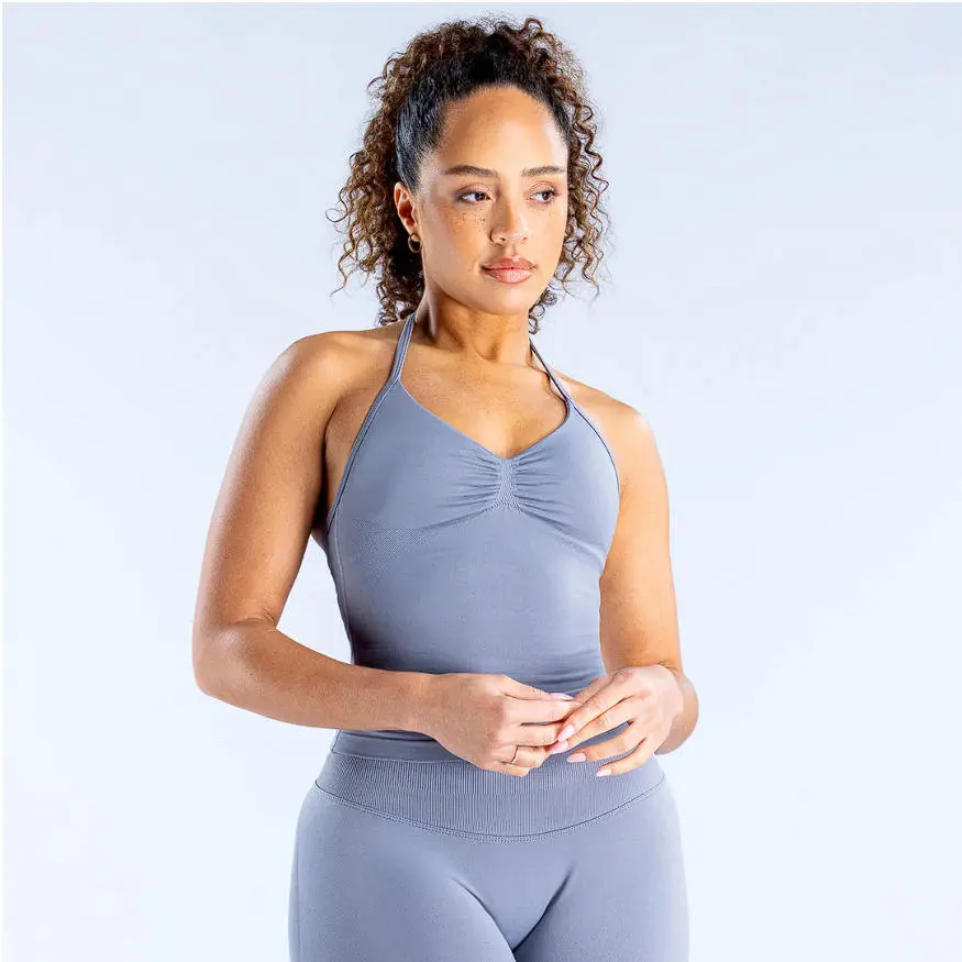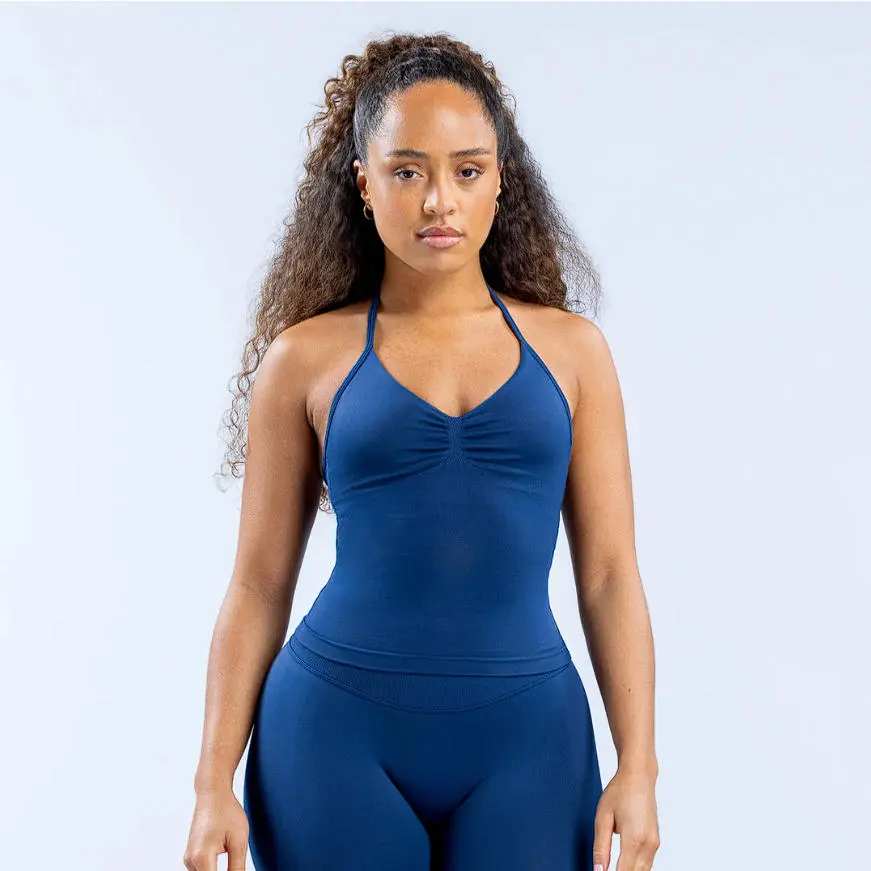 (With Logo)DFYNE Moisture Wicking 2 Piece Yoga - Breathable Seamless Halter Top & Leggings for Running Quick-Dry Compression Fitness Set
