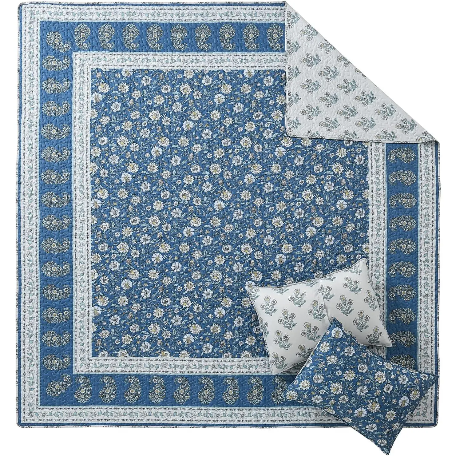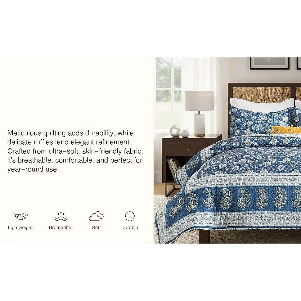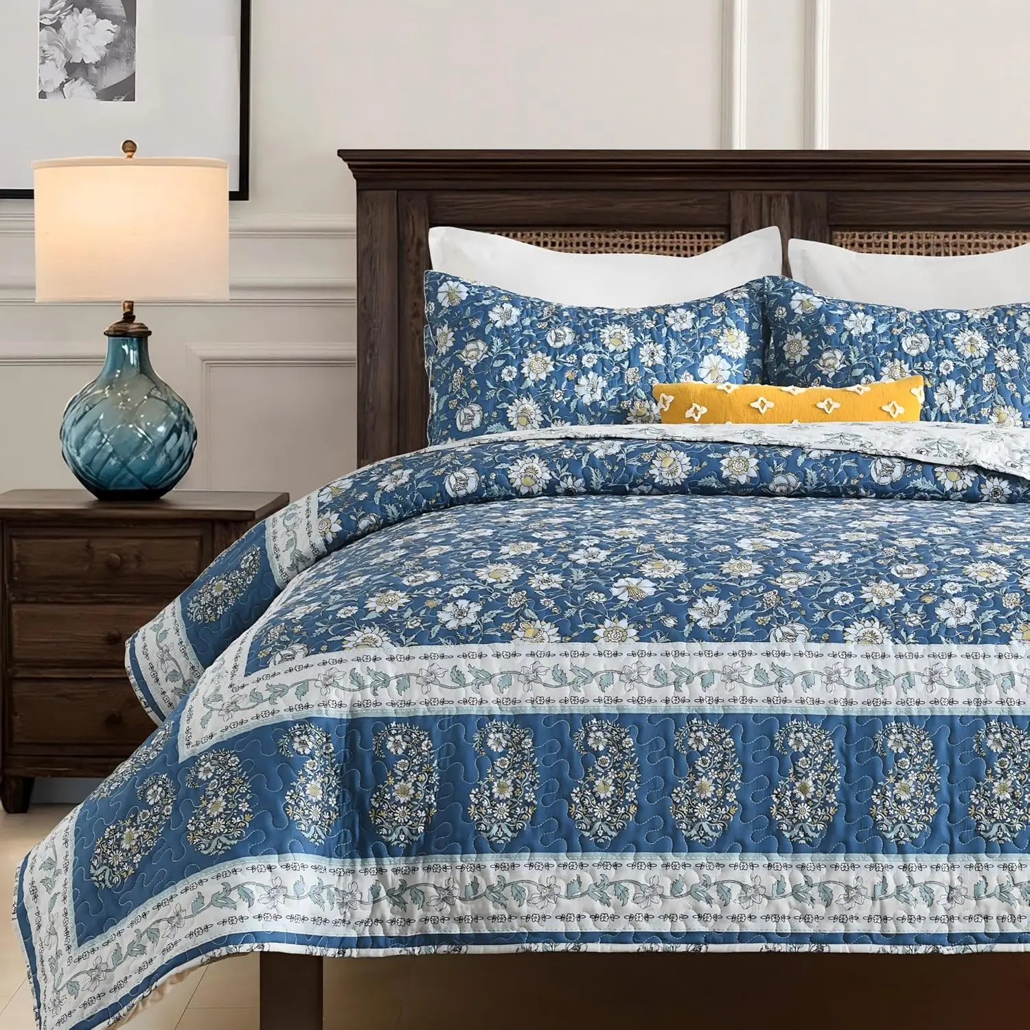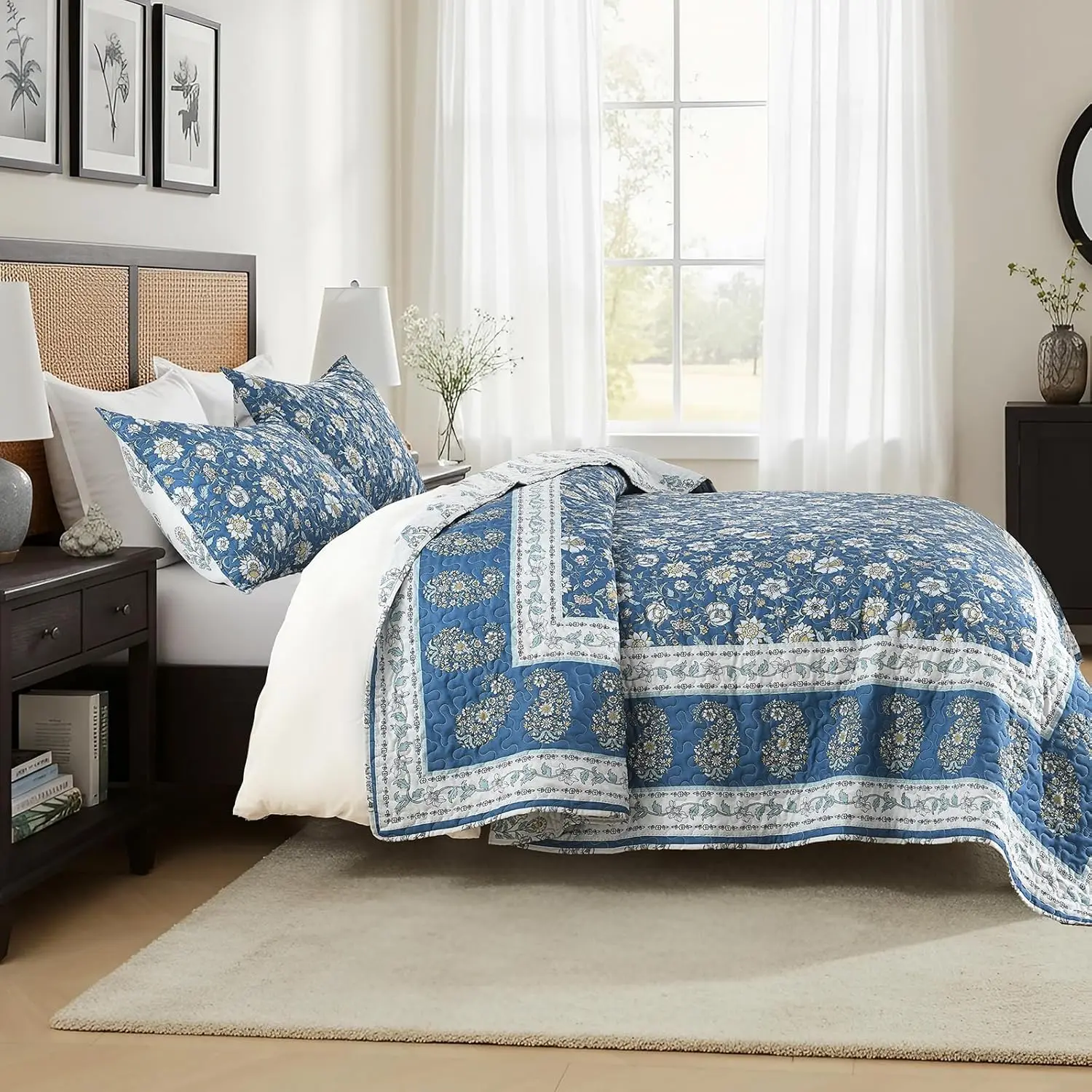 Floral Set Queen Size, Farmhouse Cottage Bedding Set, Blue Vintage Paisley Coverlets, Soft Microfiber Lightweight Reversible Bedspreads for All Season, 3 Pieces