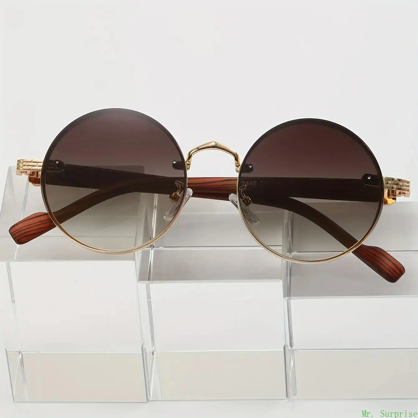 5. Men Retro Round Decorative Glasses Metal Full Rim Faux Wood Grain Temples Vintage Lightweight Eyewear