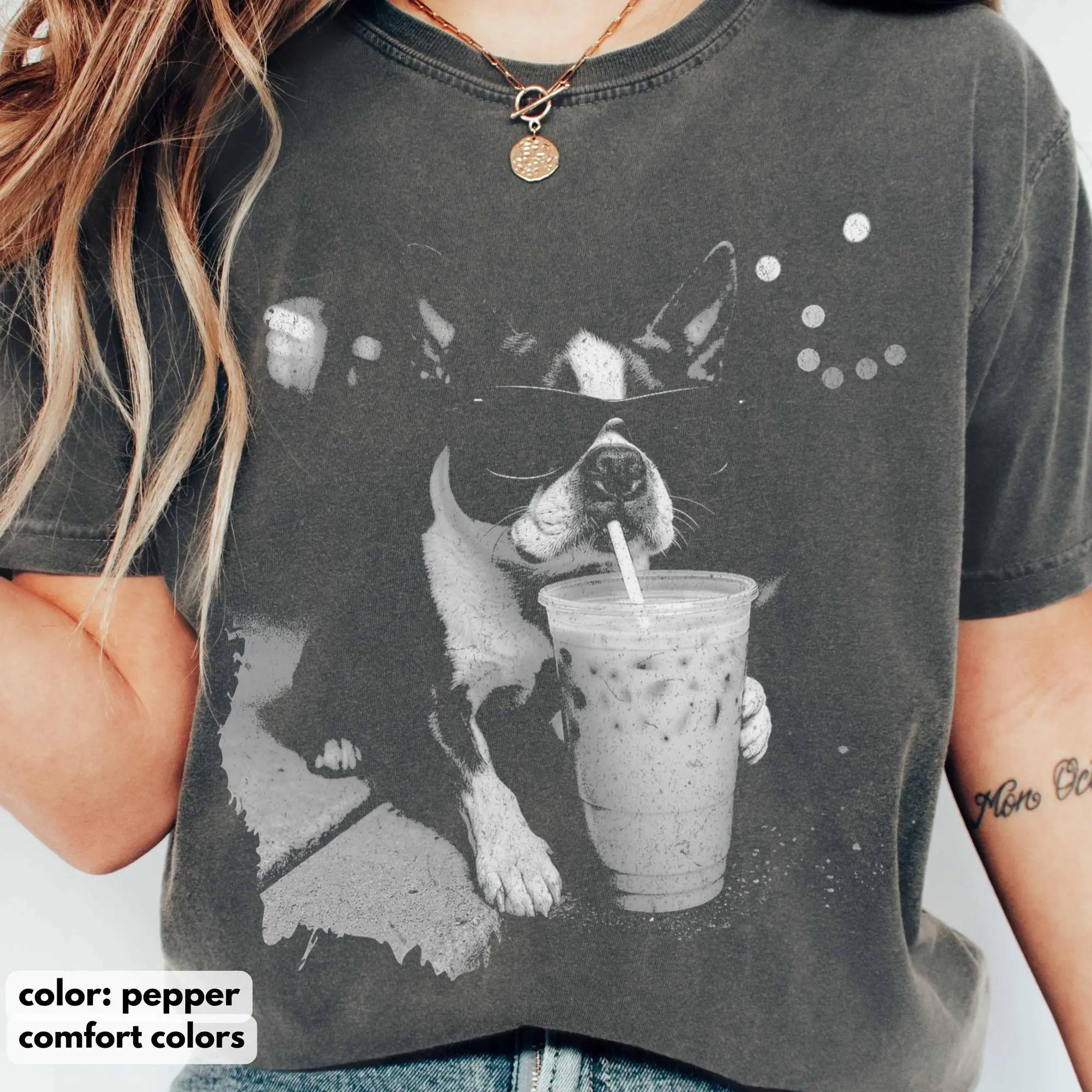 5. Funny Black White Boston Terrier Drinking Iced Coffee Comfort Colors T-shirt, Vintage 90s Edgy Dog Meme Tee, Unisex Fit Design, Casual Streetwear, Gift for Dog Lovers