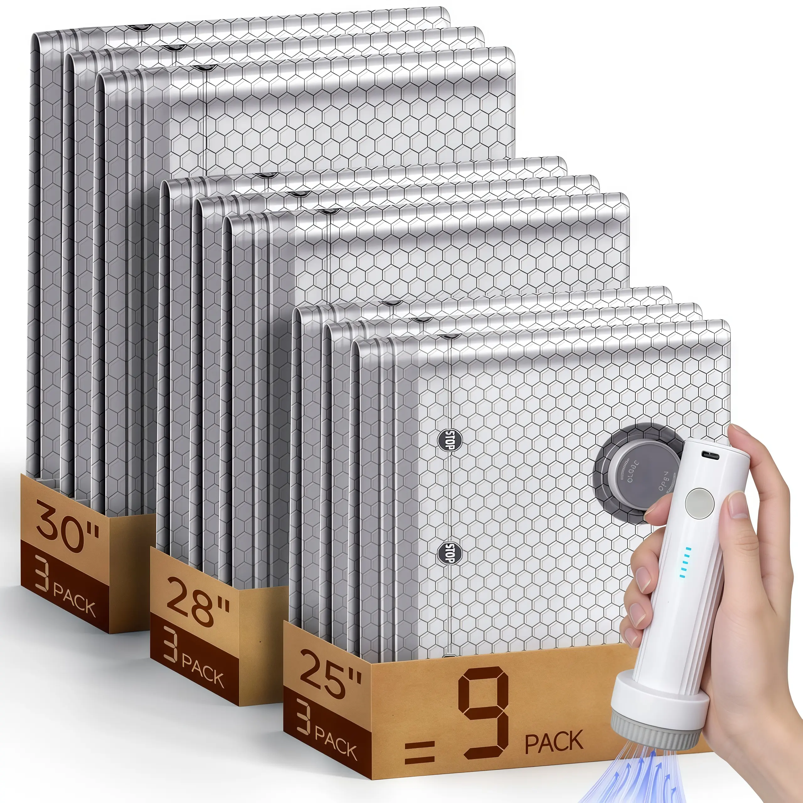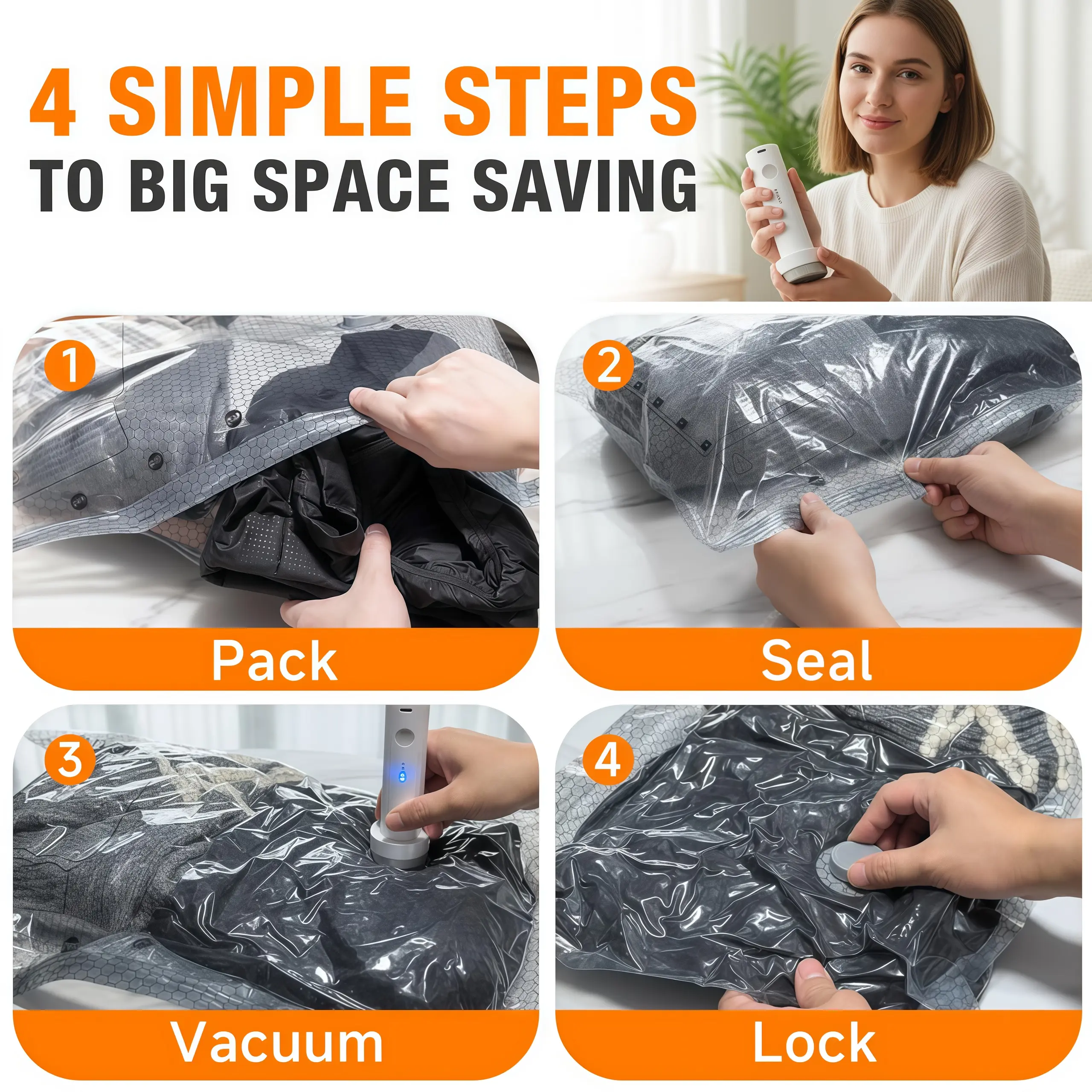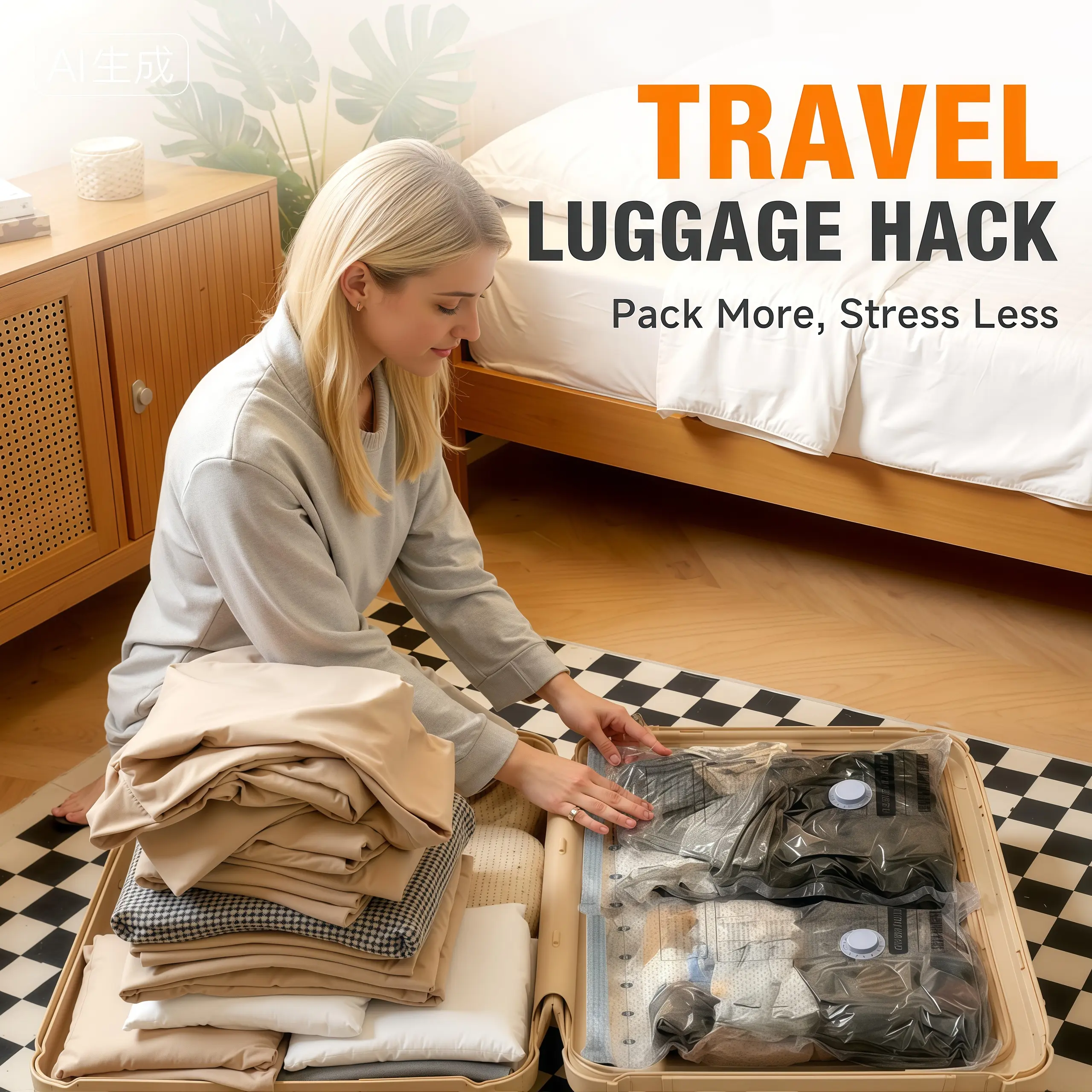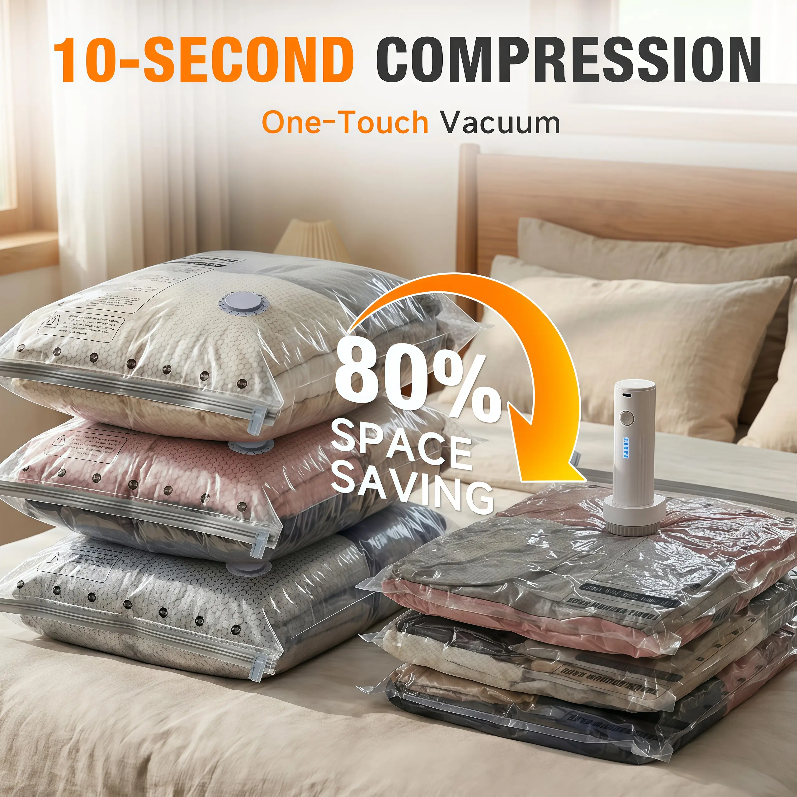 ·【Save Up to 80% Space】Travel vacuum bags with pump compress clothing to free up to 80% more space, allowing your suitcase to fit up to 3X more items. Perfect for travel packing, closet organization, and storing bulky seasonal clothing—keeping everything neat, organized, and space-efficient. Note: Vacuum compression reduces volume, not weight