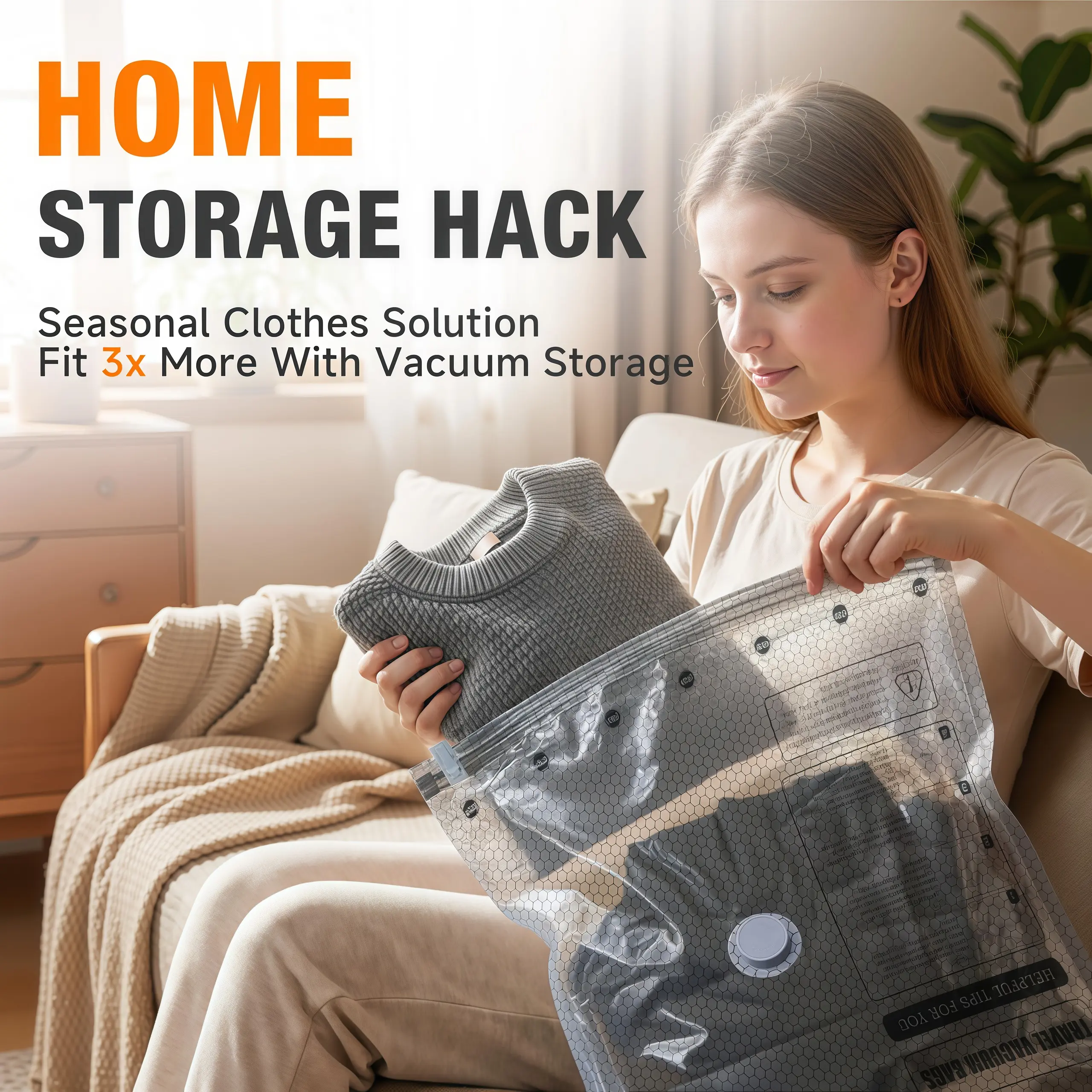 ·【Industrial-Grade Sealing】Say goodbye to re-inflating bags. Featuring a double interlocking zipper and a triple-seal air valve, these clothes vacuum storage bags for luggage deliver strong, long-lasting compression without air leaks. Effectively protects against dust, moisture, odors, and insect damage, keeping your clothes as fresh as when they were first packaged.
