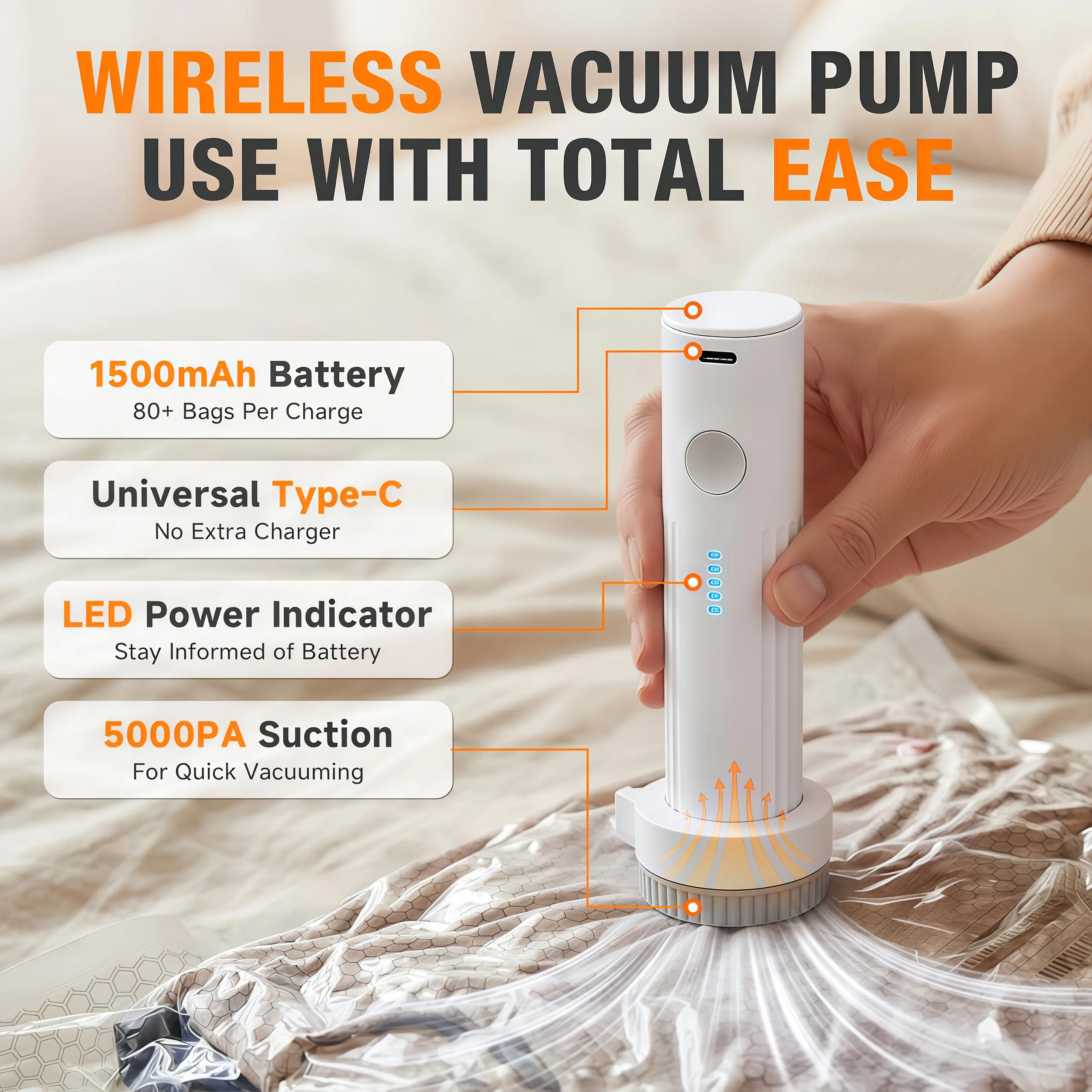 ·【5000Pa Powerful Suction】Ditch the tiring hand pumps. The 1500mAh rechargeable electric pump delivers up to 5000Pa of strong suction, compressing clothes in just 10-20 seconds. A single full charge can compress 80+ vacuum bags. Type-C rechargeable and compact , it’s easy to carry and perfect for travel or home use
