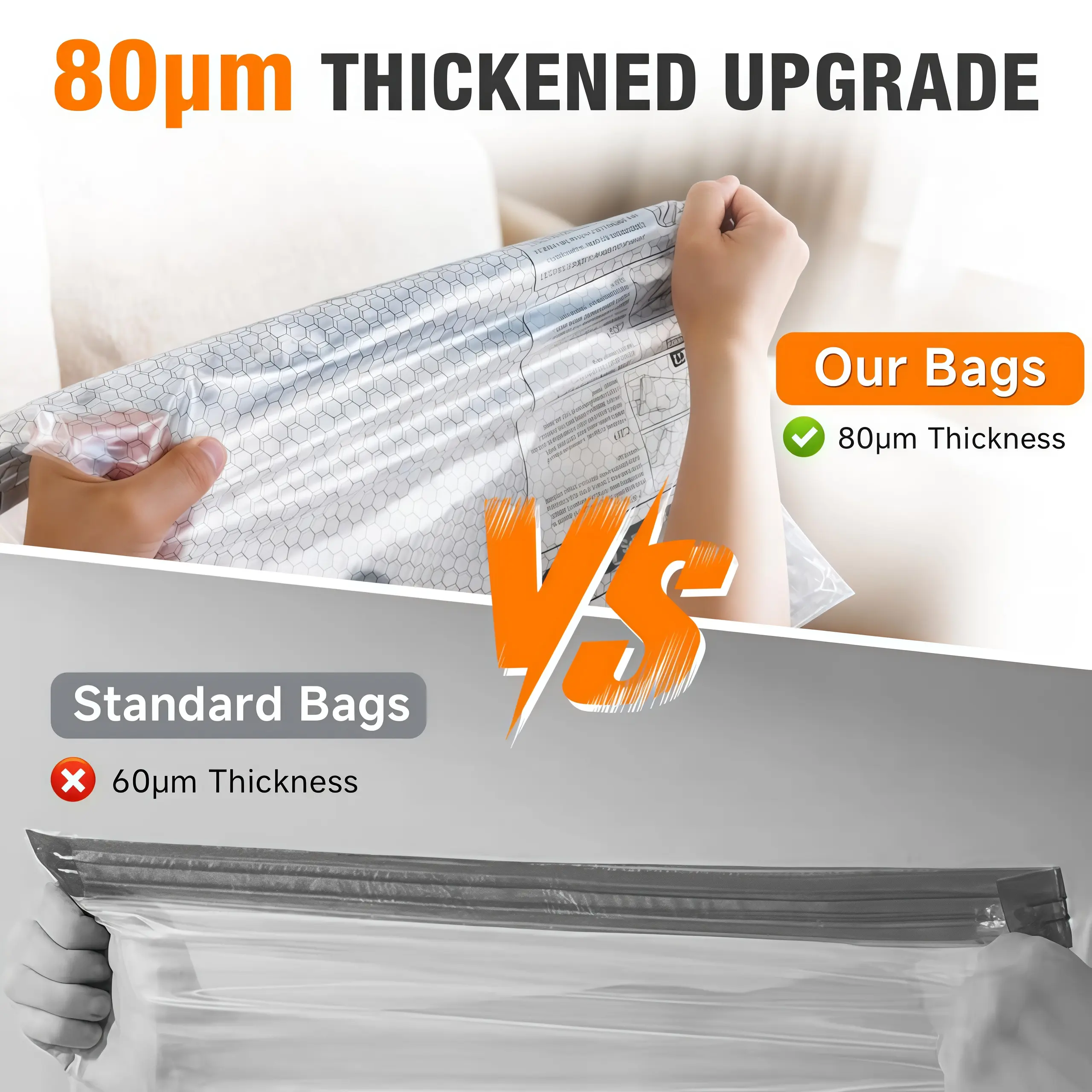 ·【Premium Thickened Material】Not all vacuum bags are created equal. Our compression vacuum bags for travel use a premium 80μm thickened PA+PE composite, making our bags 30% more tear-resistant than others. The clear design allows effortless item identification, while the extended side opening ensures smooth, convenient packing and unpacking