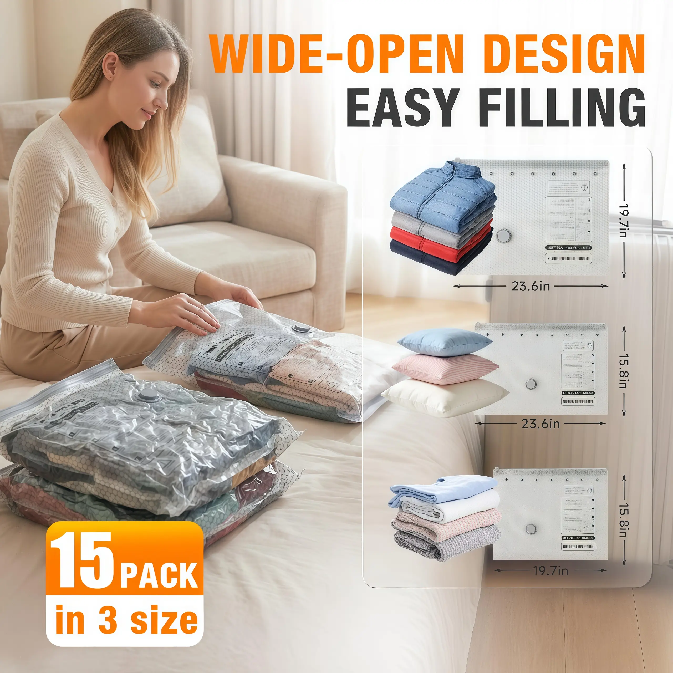 ·【3 Sizes for Versatile Storage】This 12-pack set of vacuum bags storage for blankets includes 3 practical sizes (4 bags each: 15.8*19.7 in, 15.8*23.6 in, and 19.7*23.6 in), designed to store everything from sweaters to bulky comforters. Smart sizing maximizes space efficiency, making it an ideal companion for both home organization and travel