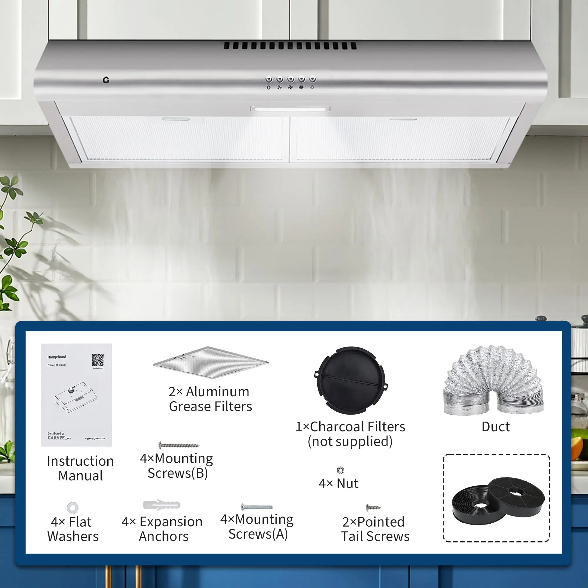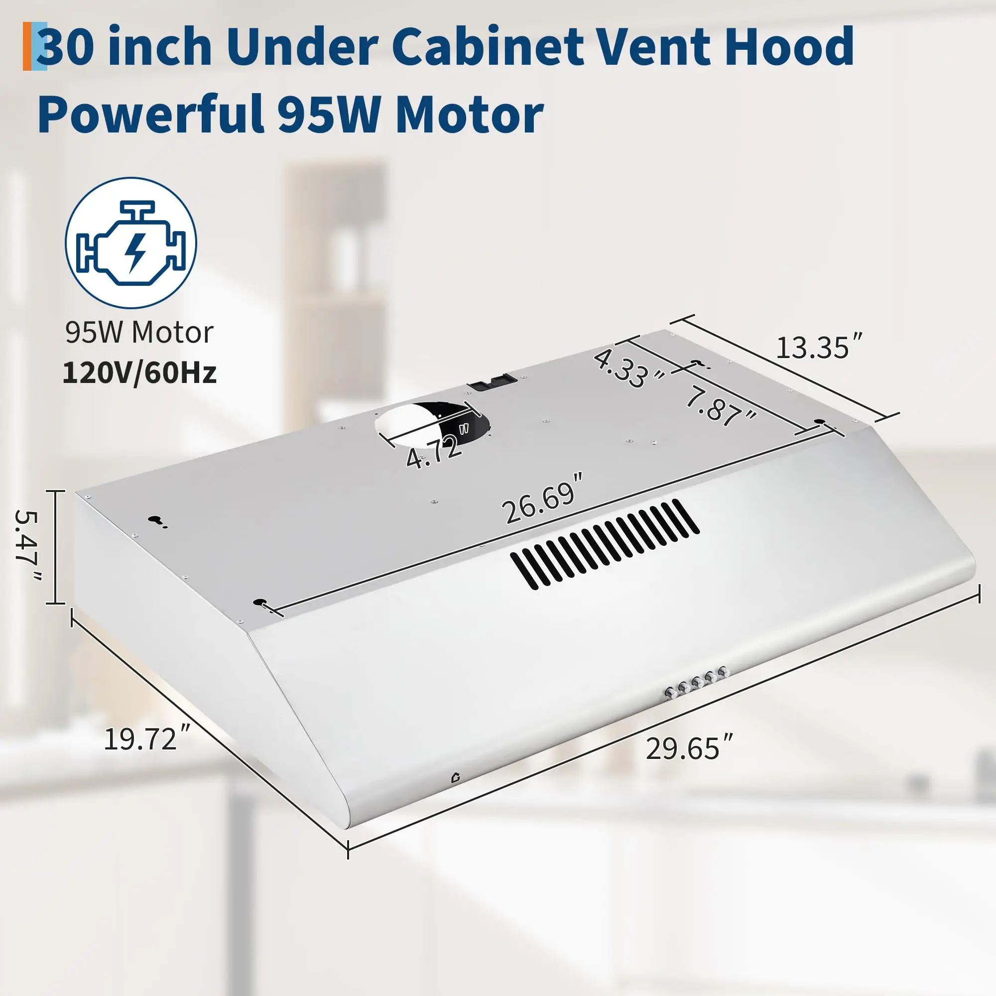 30 Inch Under Cabinet Range Hood, 100 CFM Stainless Steel Kitchen Exhaust Fan, Ducted & Ductless Ventilation, 3-Speed Settings, LED Lighting, Quiet Operation & Easy Installation