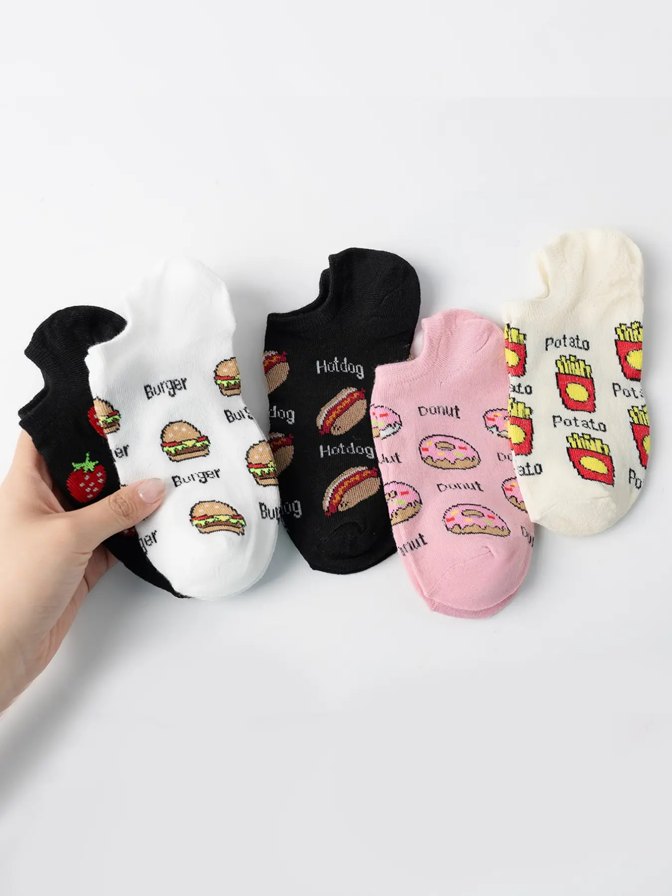【Food Patterns】: Featuring cute hamburger, strawberry, and fries patterns, adding fun to your daily wear.