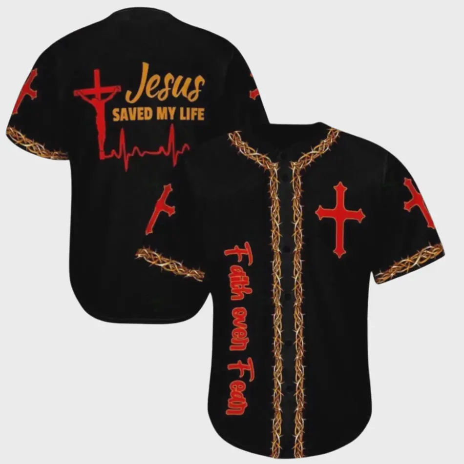 Christian Cross Baseball Jersey Faith Over Fear Button Up Shirt Black Red Church