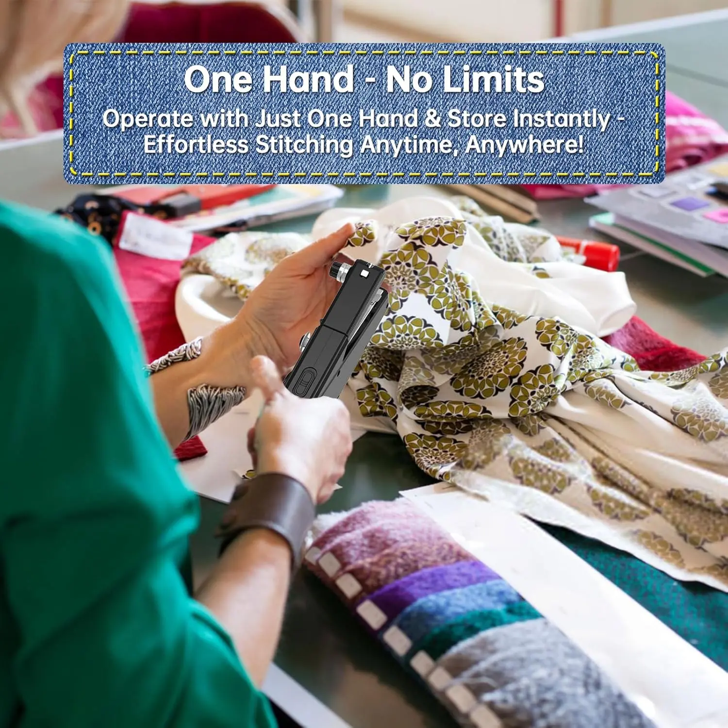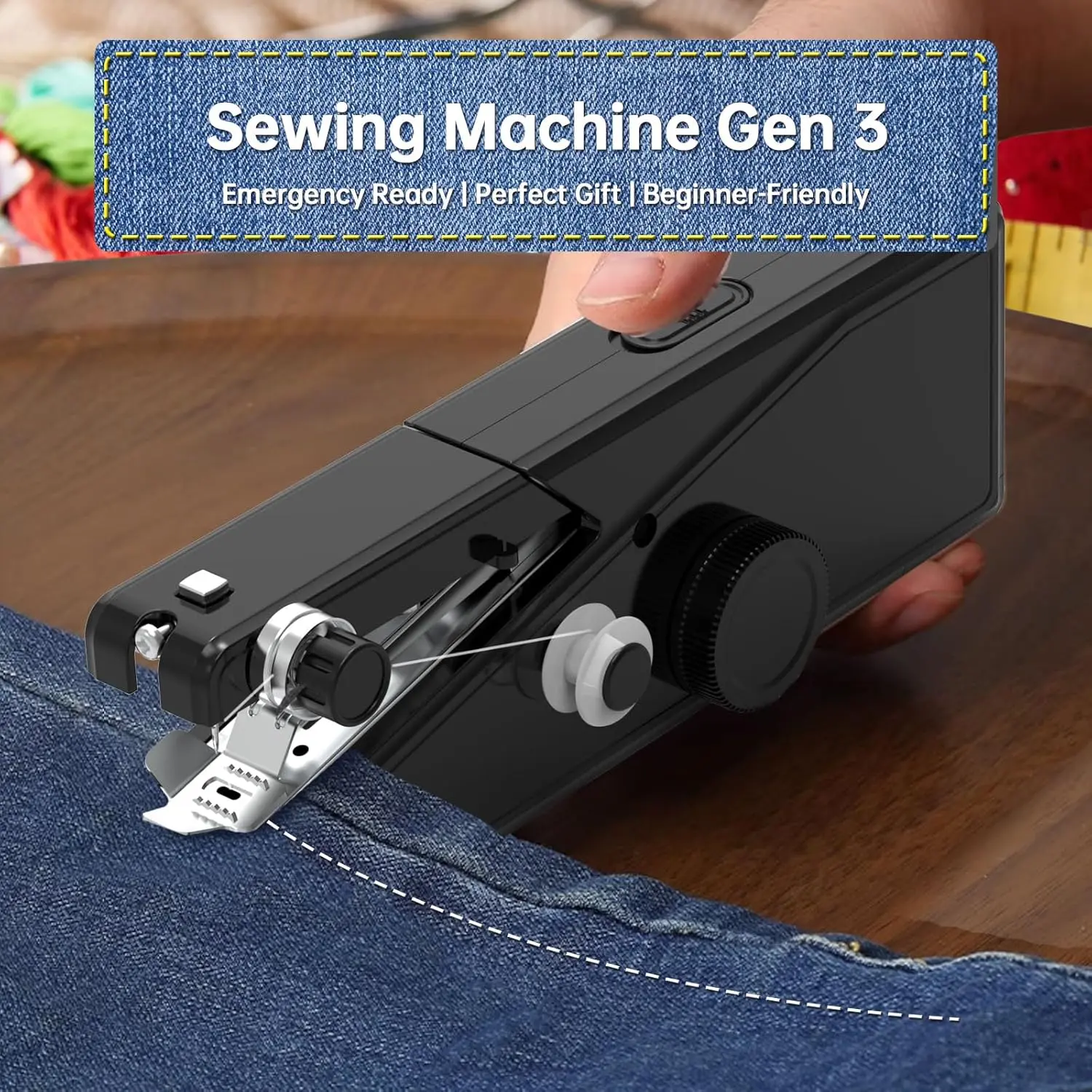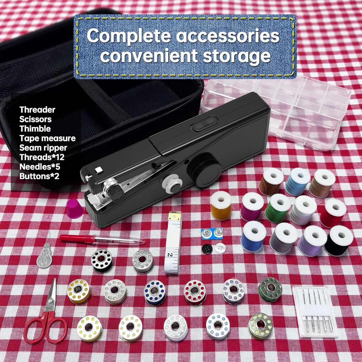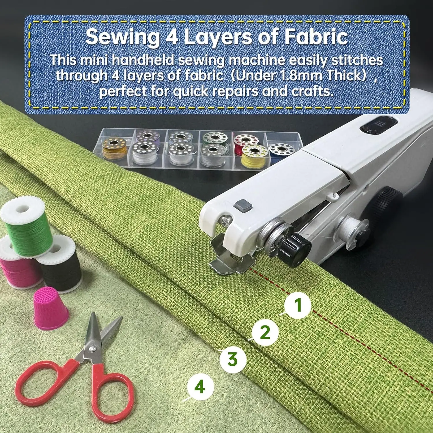 Portable & Battery-Powered: This mini handheld sewing machine operates on 4 AA batteries (not included), making it ideal for on-the-go repairs and travel. It does not support charging or USB power, ensuring simple, cord-free operation.Easy to Use with One Speed: Designed for beginners, it features a single-speed function for hassle-free stitching.Just press the button to start sewing-no complicated settings or adjustments needed.Complete Sewing Kit Included: The package includes essential accessories: a threader, scissors, thimble, tape measure, seam ripper, 26 threads, and 5 needles, providing everything for quick fixes and DIY projects.Lightweight & Versatile: Compact and ergonomic, it easily handles fabrics like cotton, denim, and curtains (up to 1.8mm thick).Perfect for hemming, patching, and crafting without bulky equipment.Ideal for Quick Repairs & Gifts: A practical tool for emergencies or small sewing tasks. Great as a gift for beginners, kids, and hobbyists on birthdays, or holidays.