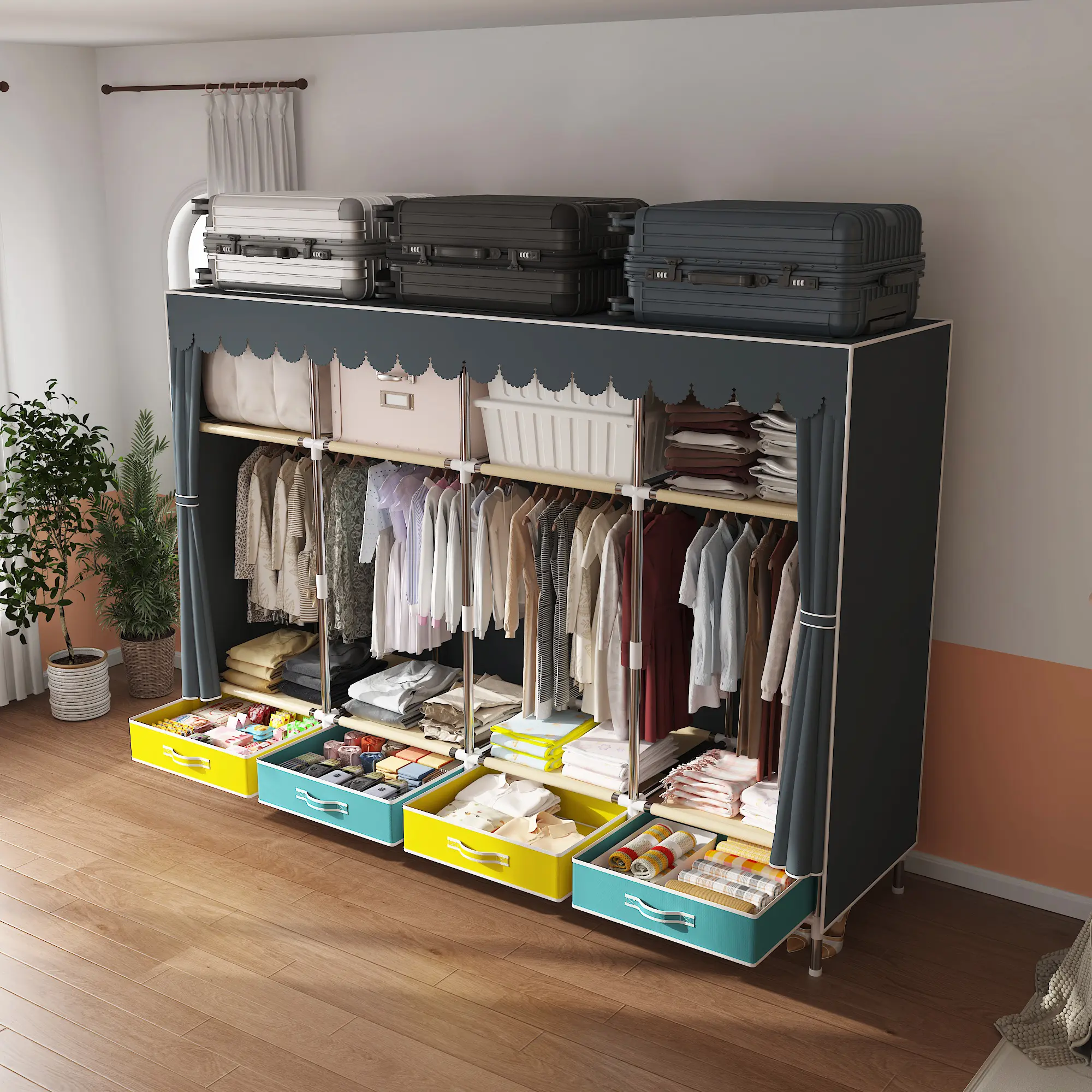 Large Portable Wardrobe with 4 hanging rods and drawers. This armoire is perfect for organizing your bedroom closet. It features metal storage wardrobe hangers for durability. The upgraded grey non-woven dust cover ensures your clothes stay clean. Ideal for large closets, this wardrobe offers ample storage space.