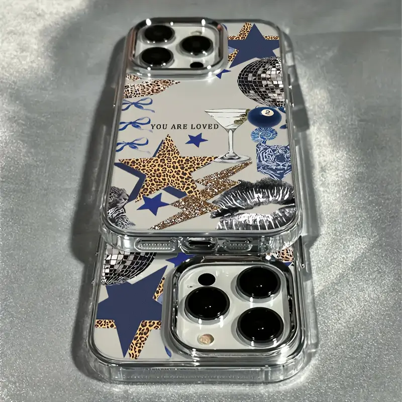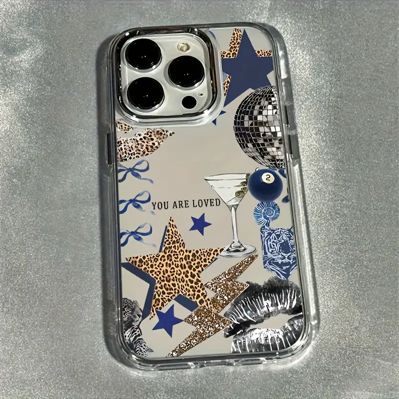 The phone case is suitable for various iPhone models including iPhone 17, iPhone 16, iPhone 15, iPhone 14, iPhone 13, and iPhone 12. The luxurious transparent electroplated lens protection case is the perfect trendy and creative gift for couples