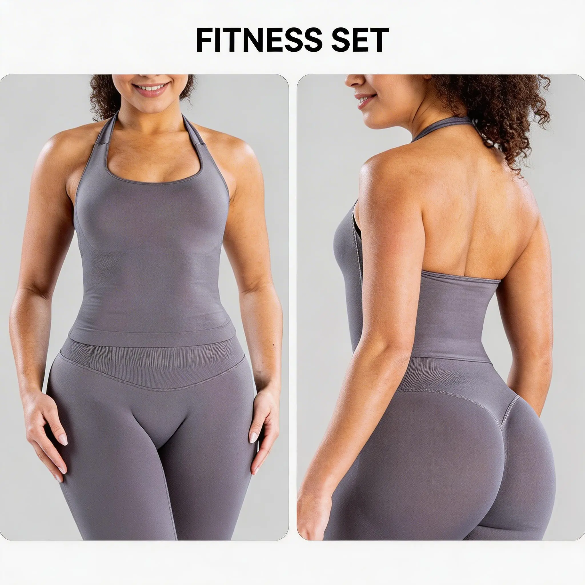 2 Piece Seamless Set Halter Neck Open Back Sports Bra + High Waisted Leggings