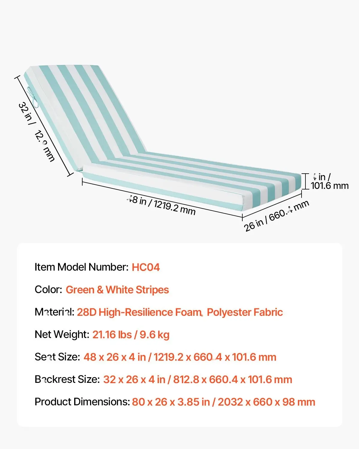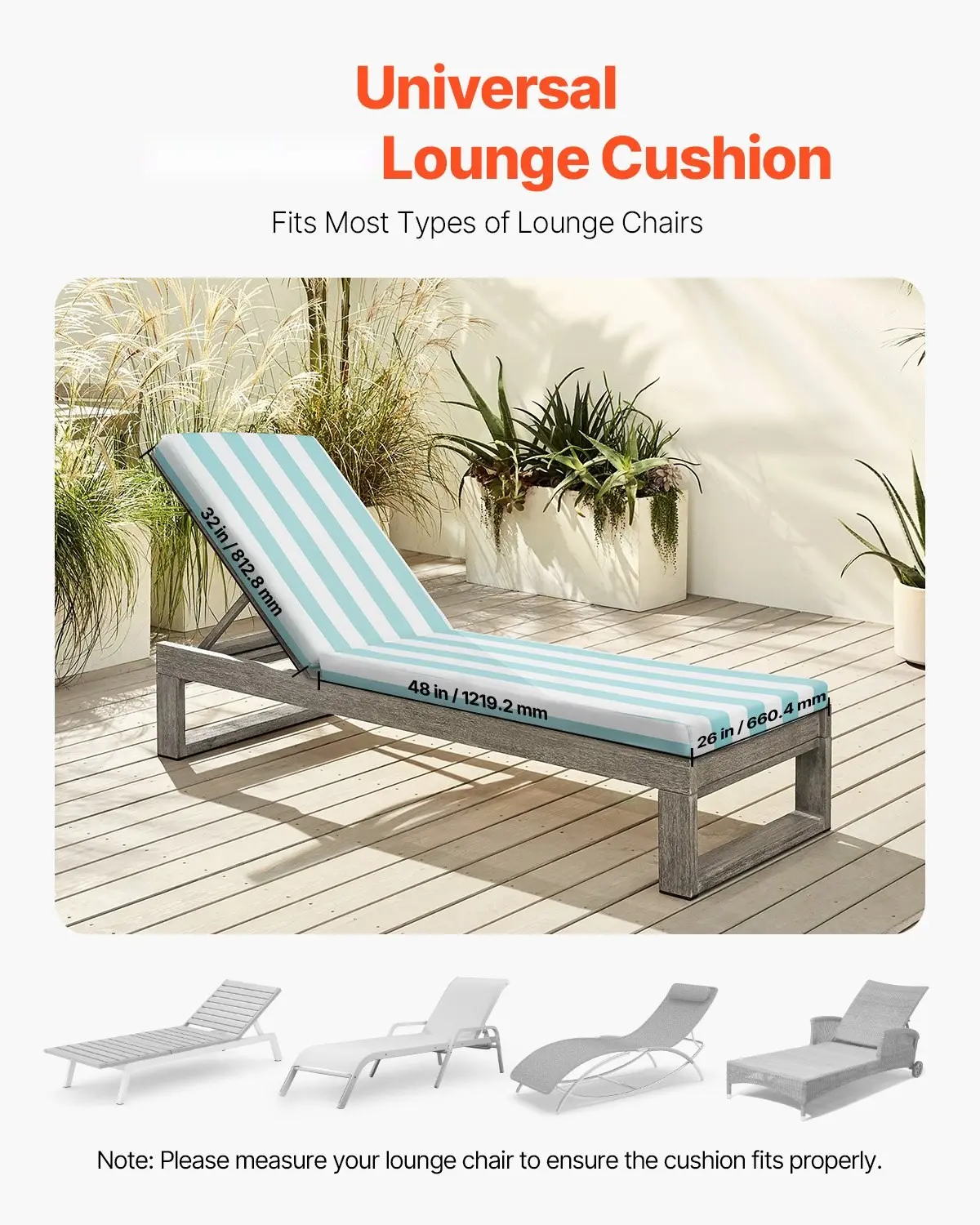 ·Universal Fit: This set of 2 outdoor lounge cushions features a seat size of 48 x 26 x 4 in / 1219.2 x 660.4 x 101.6 mm and a backrest size of 32 x 26 x 4 in / 812.8 x 660.4 x 101.6 mm, designed to fit most standard lounge chairs. It offers full-body support and lasting comfort. For optimal fit, please measure your chair before purchase.