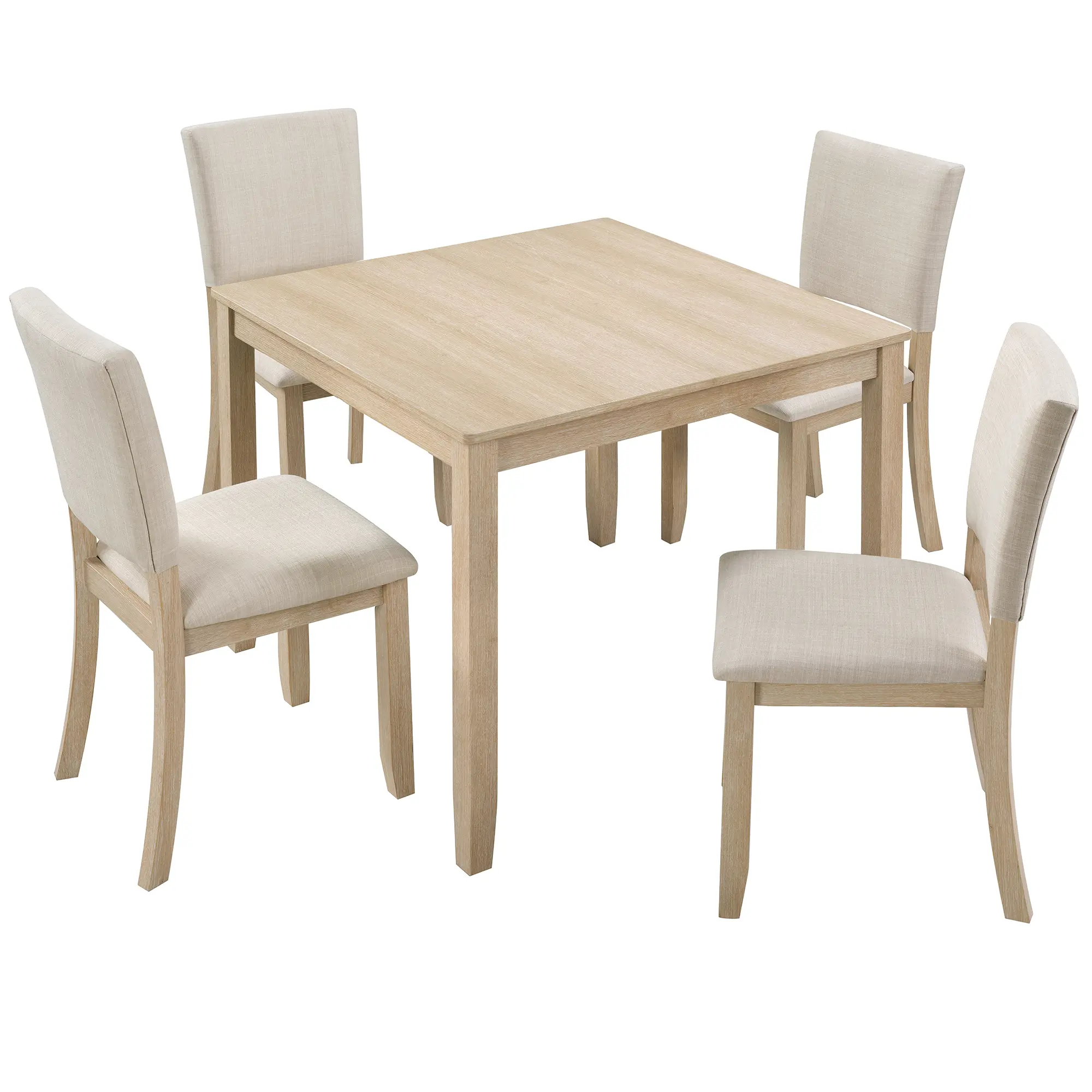 ·Modern Wooden Dining Set: This kitchen dining table set includes a square dining table and four upholstered chairs. With a clear and detailed natural wood grain on its surface, it features a clean and modern design that can match a variety of interior decoration styles. Whether in a kitchen, dining room, or small apartment, it adds an elegant touch to any space.