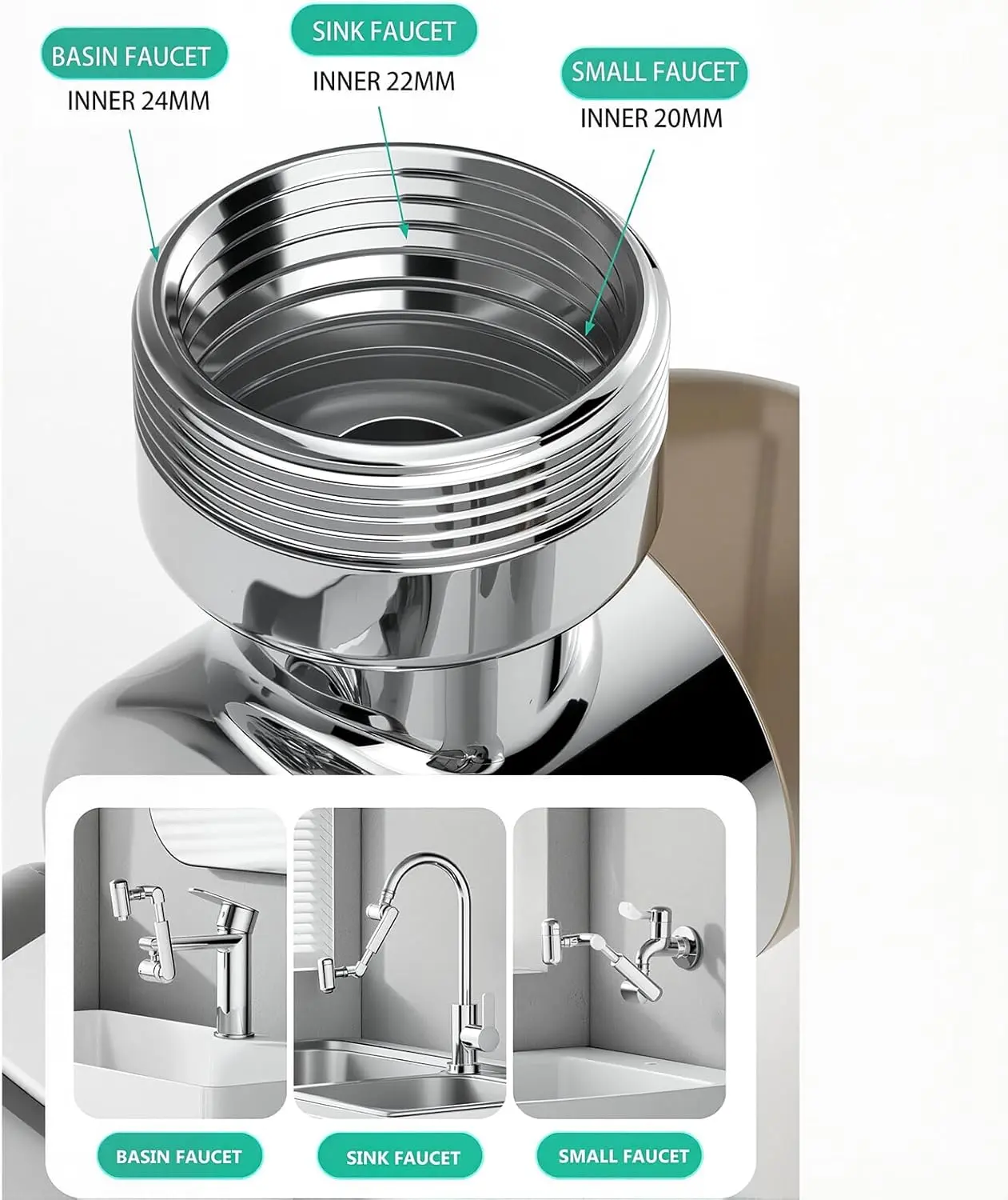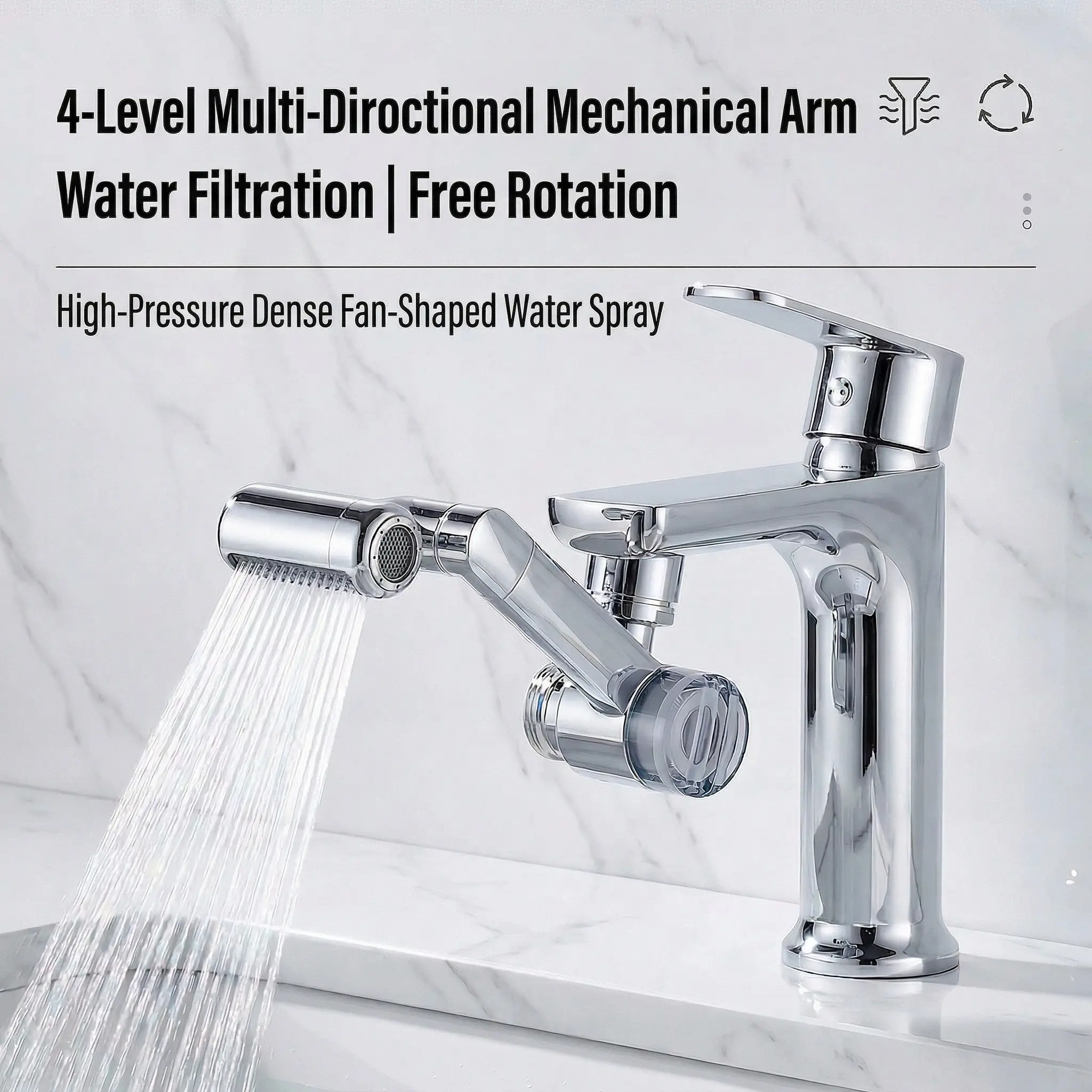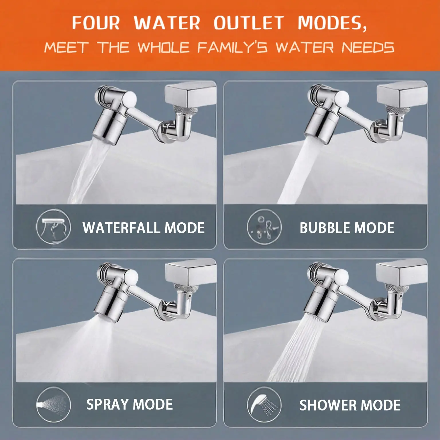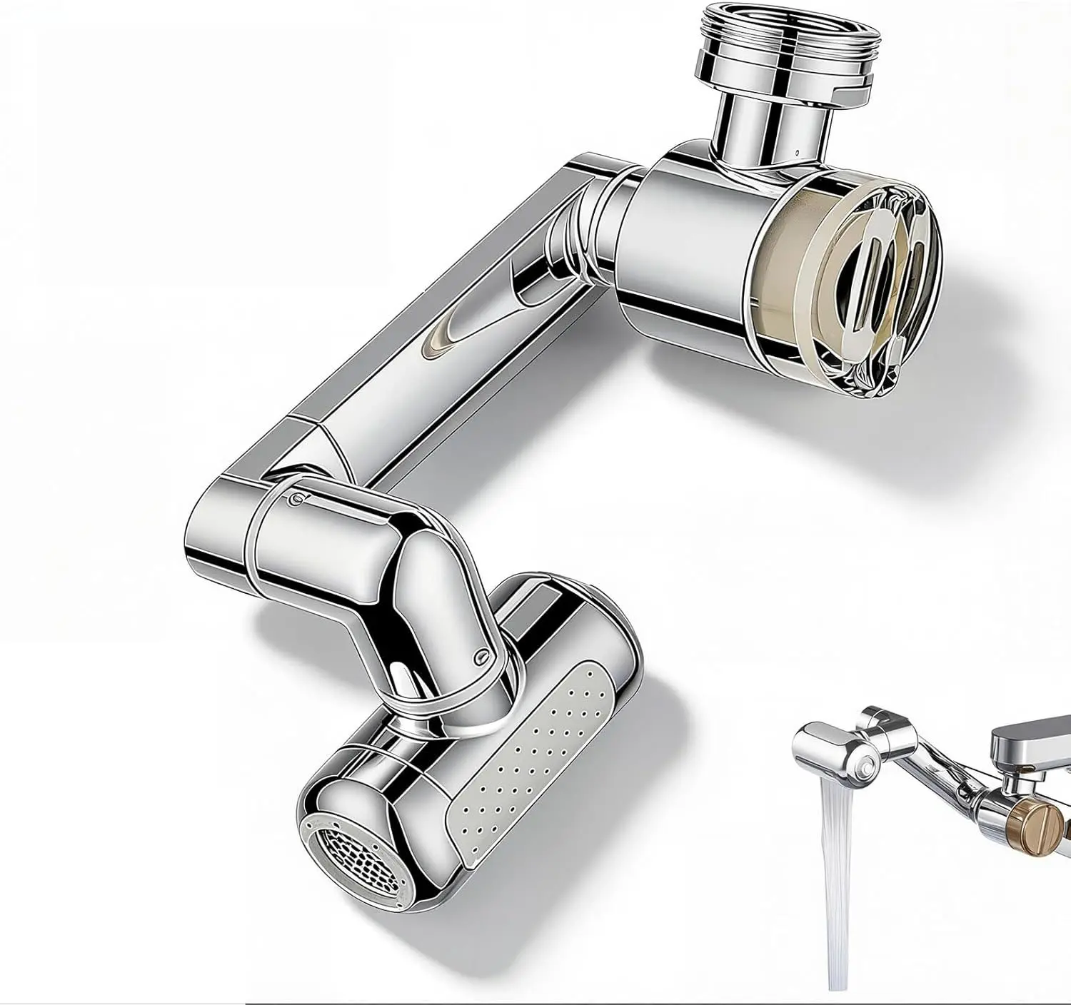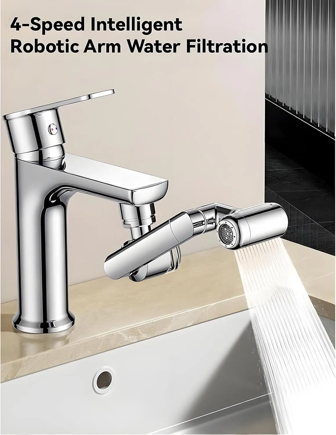 Upgrade your sink with the 1080°Swivel Faucet Extender. This sink water faucet aerator extension is crafted in brass, ensuring durability and style. The swivel robotic arm offers versatile water control. Perfect for bathrooms and kitchens, this rotating extension filter comes with 4 mode splash options. Enhance your daily routine with this innovative faucet extender.
