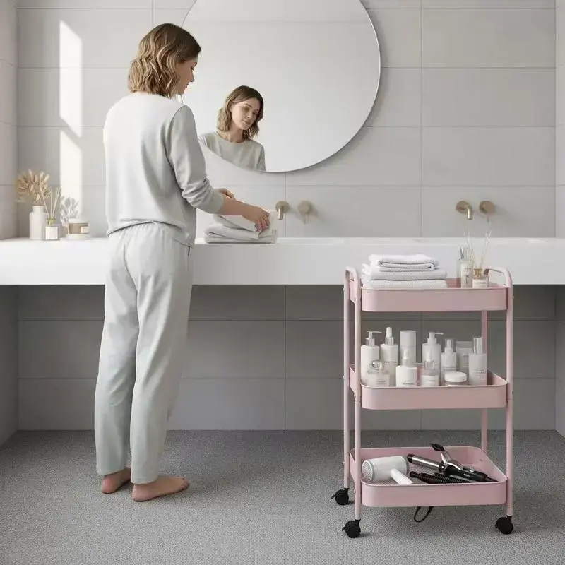 3-Tier Rolling Utility Cart with Lockable Caster Wheels Easy Assembly for Kitchen Bathroom Office Supplies Makeup Crafts Metal Construction Durable Sturdy Versatile Use Large Capacity