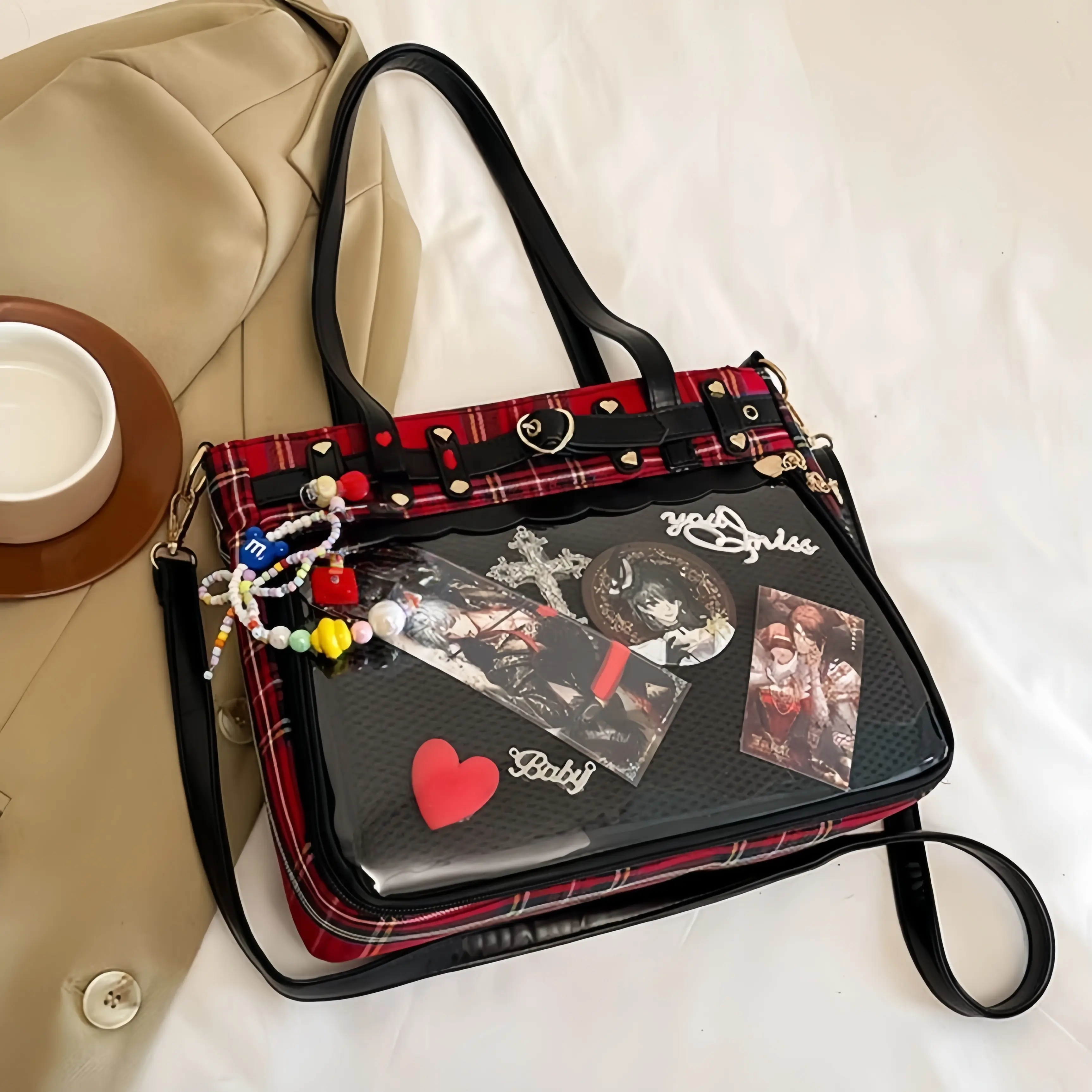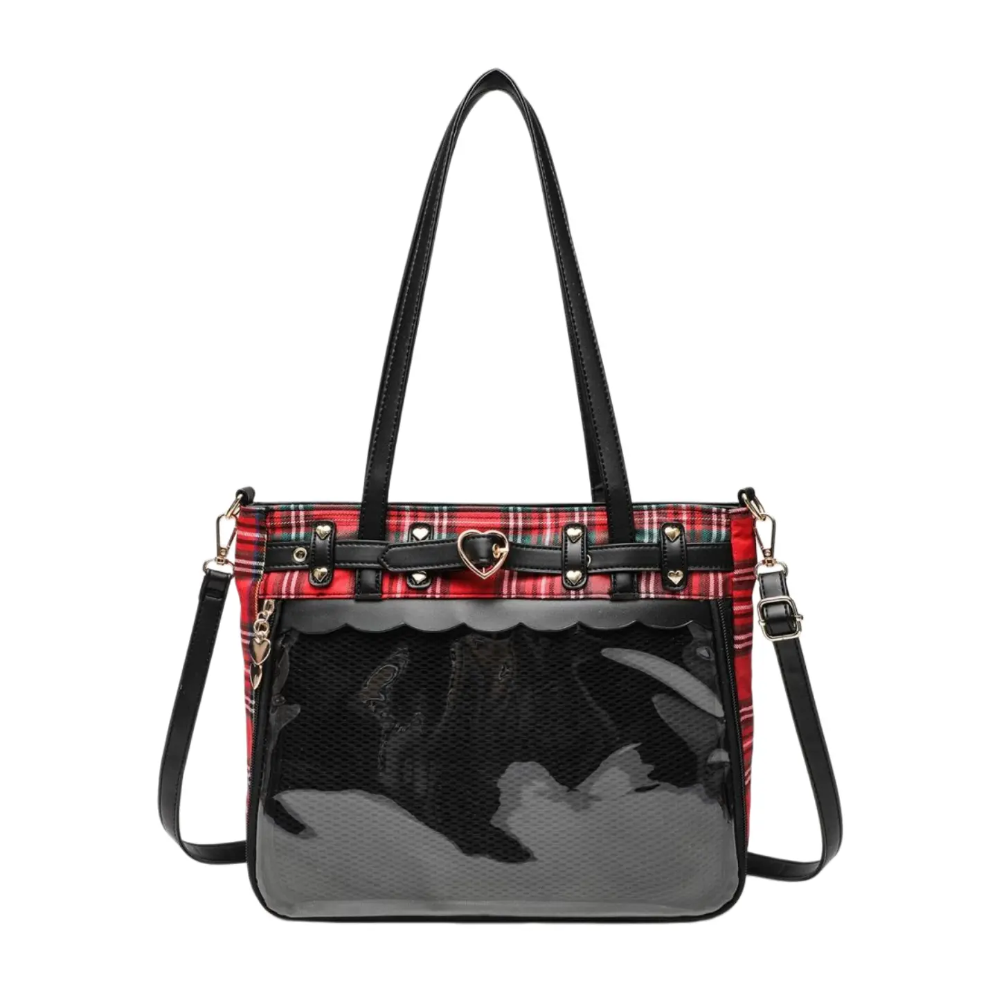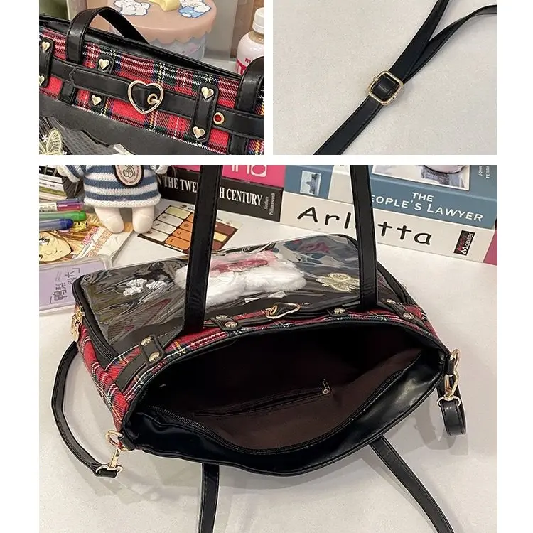This 2-way clear window handbag features a red black tartan print and heart buckle accents. Perfect for anime pins, badges, and photo displays. Ideal for anime cons, K-pop fans, and daily use. The bag includes a detachable strap and dual top handles.