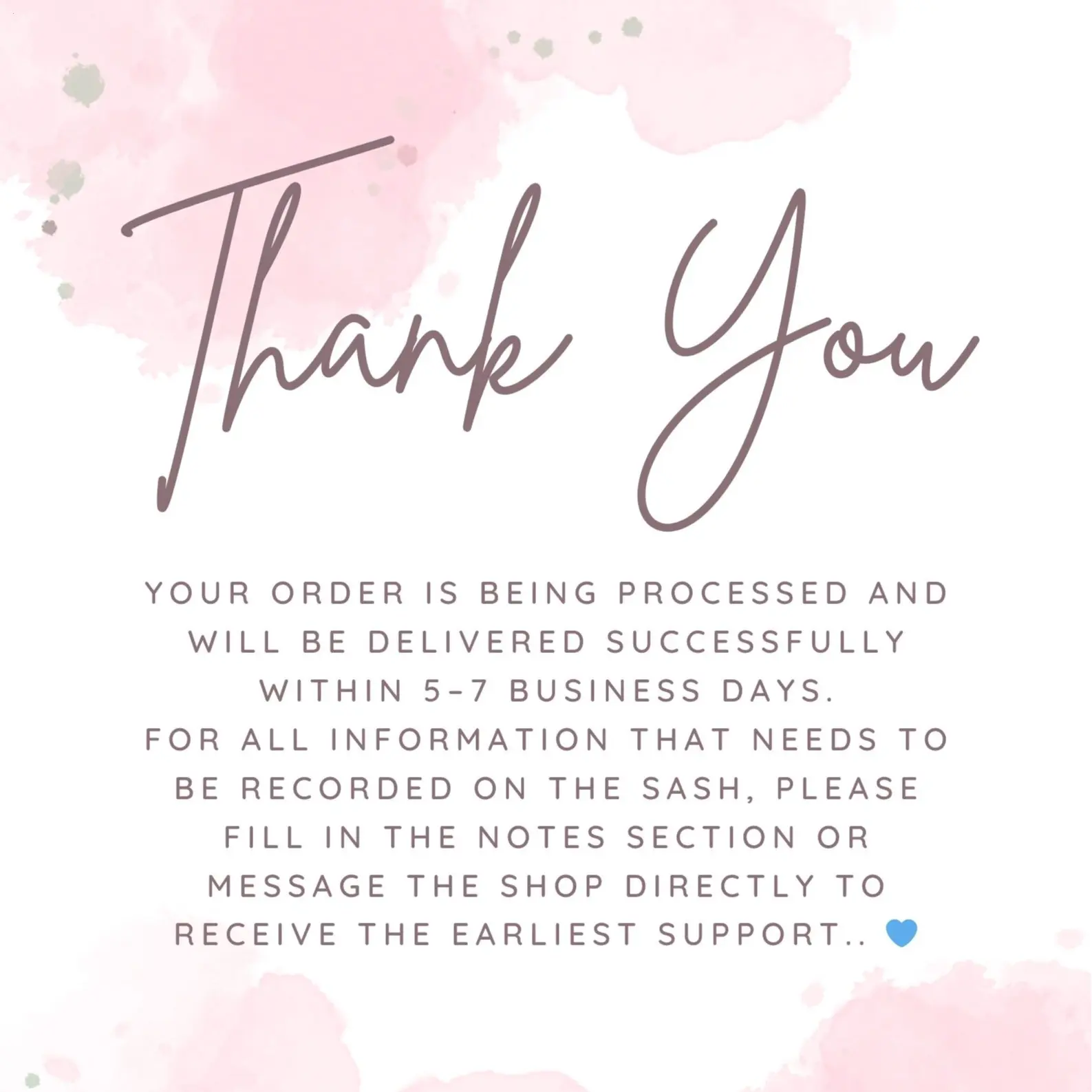 For all information that needs to be recorded on the sash, please fill in the notes section or message the shop directly to receive the earliest support.