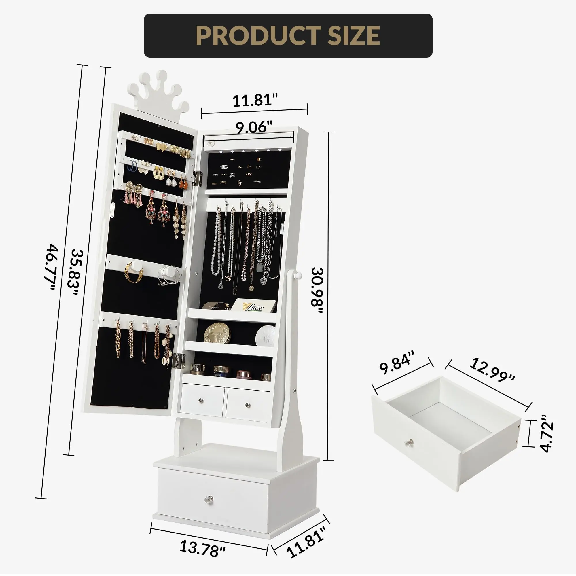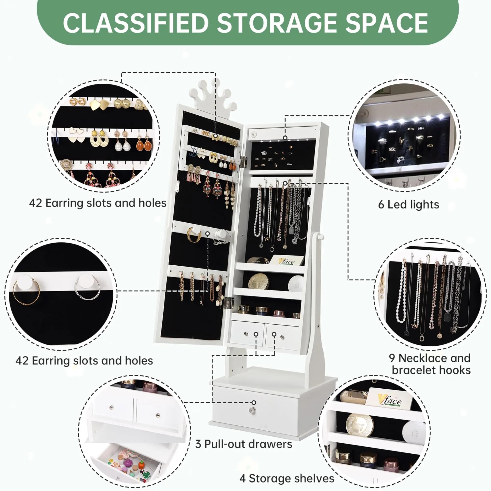 · Comprehensive & Organized Jewelry Storage 🎀Never misplace a treasure again! This armoire is a storage superstar, featuring a dedicated ring board, 9 necklace hooks, 5 collection hooks, a 3-tier display shelf, a 42-slot earring rack, and 3 spacious drawers. It effortlessly organizes every bracelet, ring, necklace, and hair accessory for instant, tidy access.