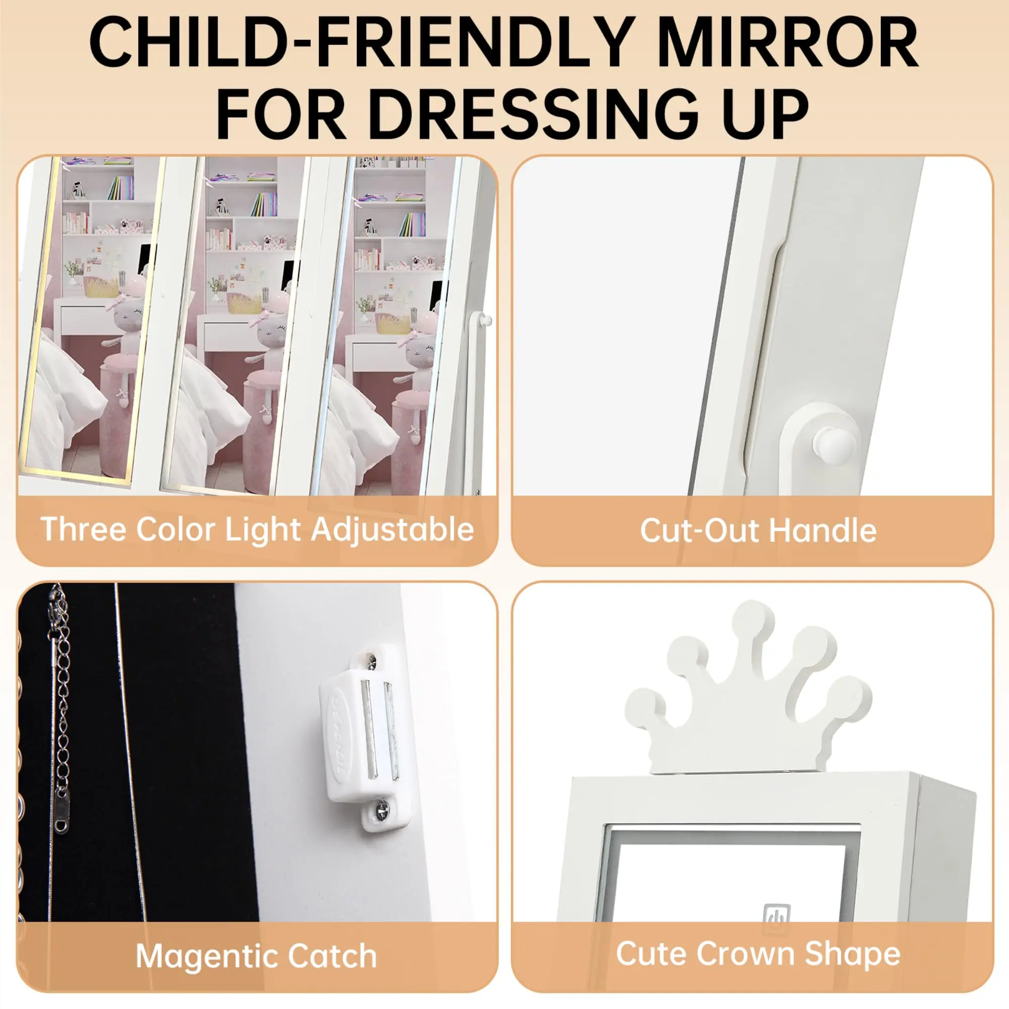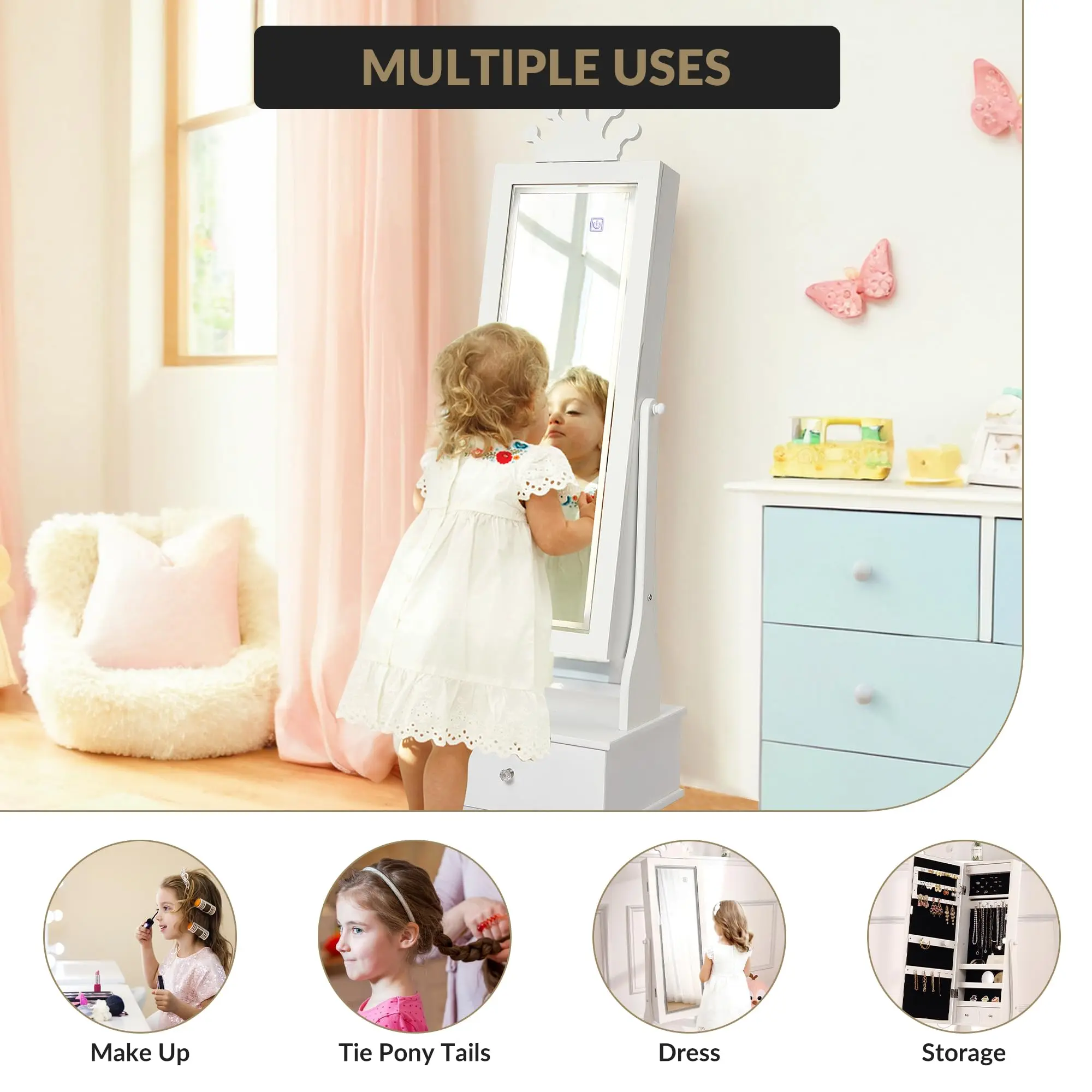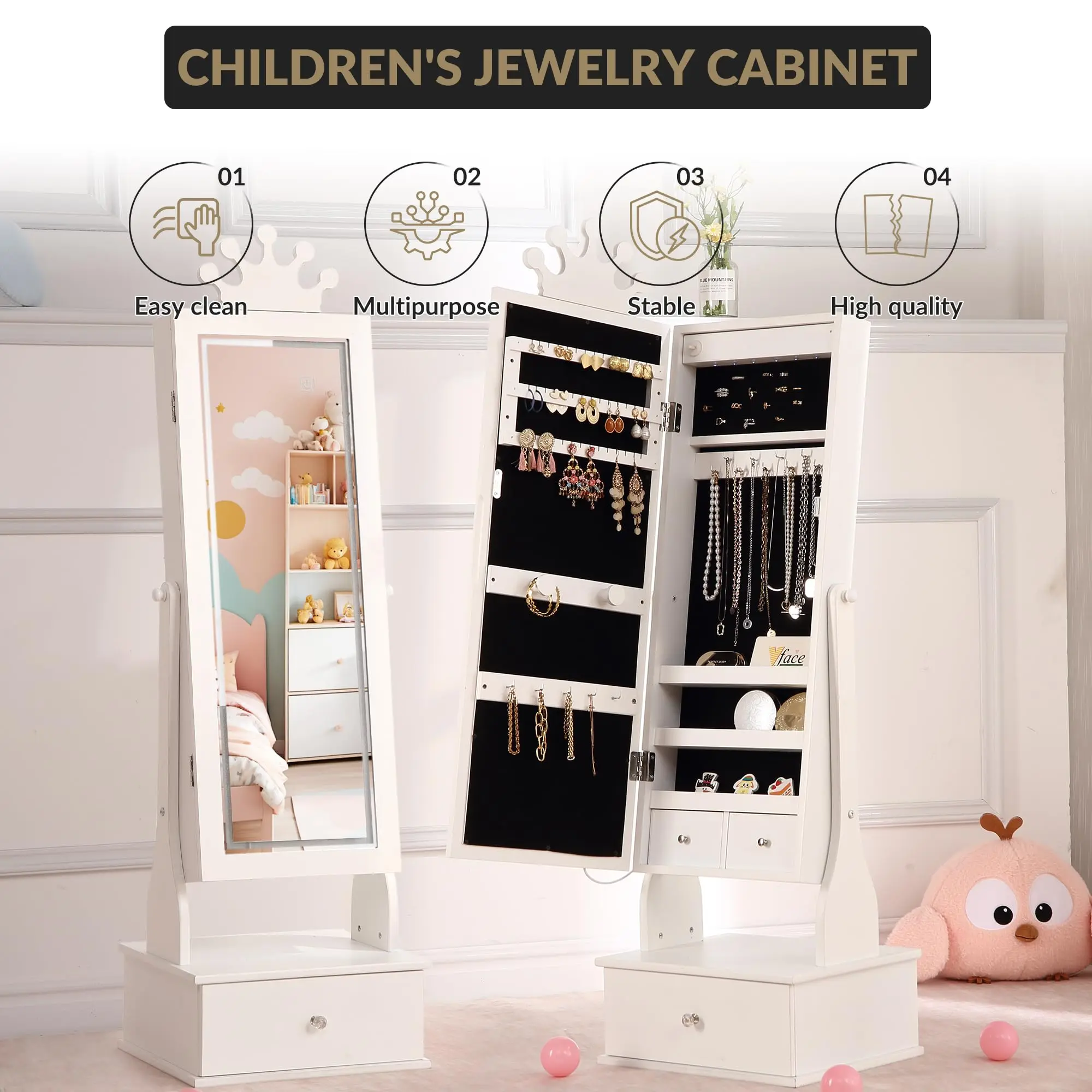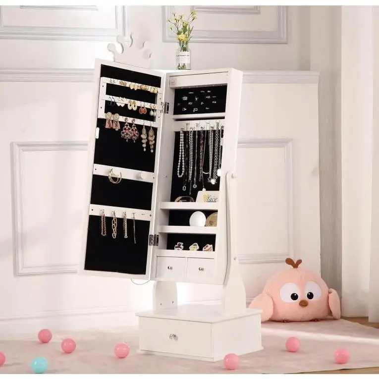 · Princess-Themed Enchanting Design 👑Transform any room into a royal chamber! The charming crown-shaped mirror and whimsical design details create a magical, regal atmosphere. It’s more than storage—it’s a delightful centerpiece that sparks imagination and adds a fairytale touch, perfect for girls ages 3 and up.