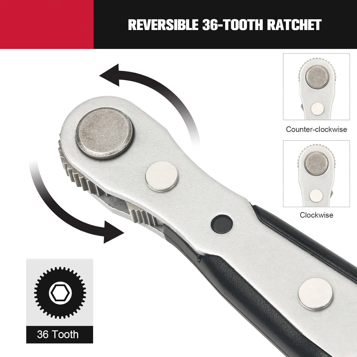[Ratcheting Mechanism]This 1/4 ratchet wrench is powered with a 36-teeth reversible ratchet system to ensure smooth ratcheting in both directions.High-quality fine tooth provide high torque and precise adjustment.Simply flip the spin button to change direction for tightening or loosening screws.The 90 degree screwdriver features a magnetic holder accepts any 1/4 inch hex bits