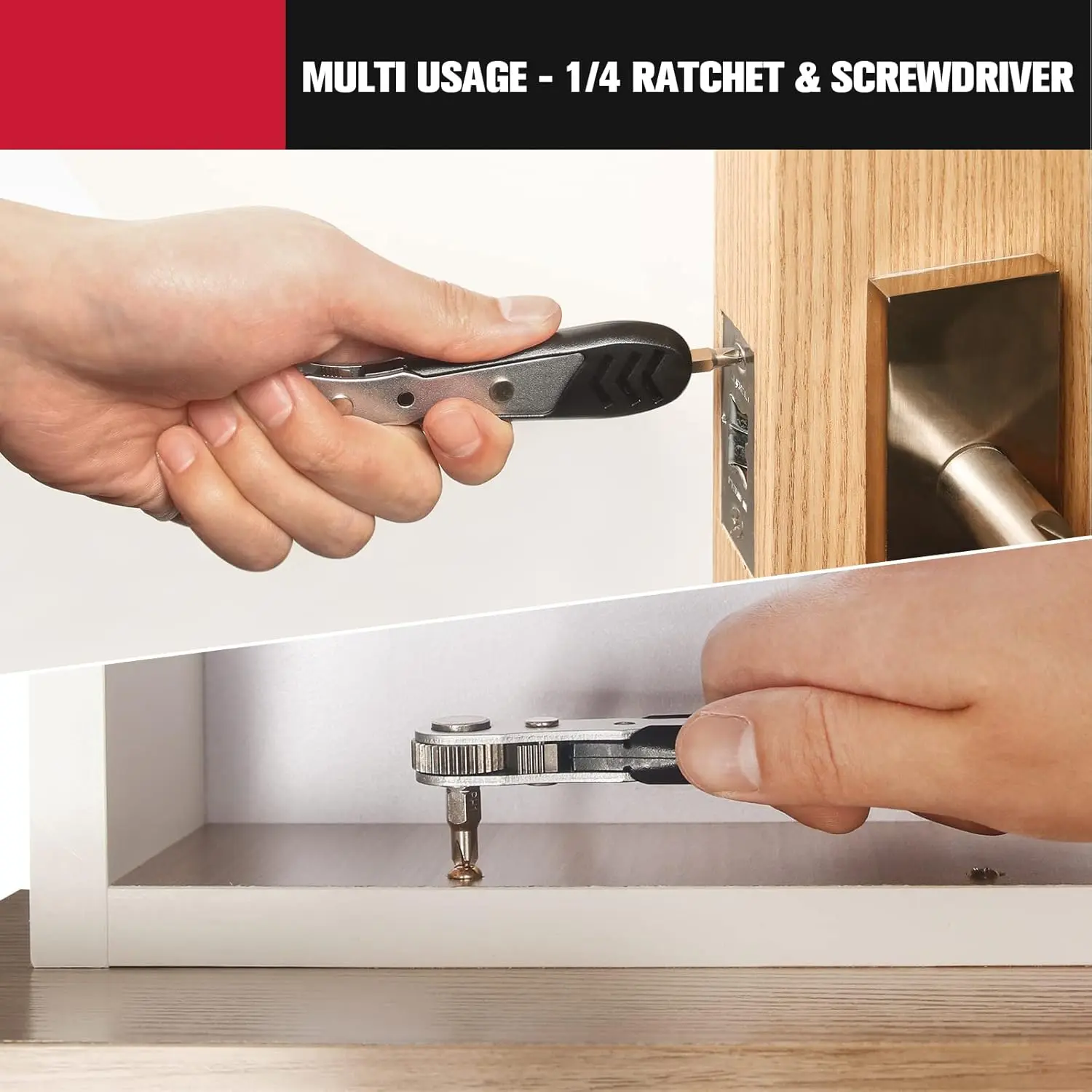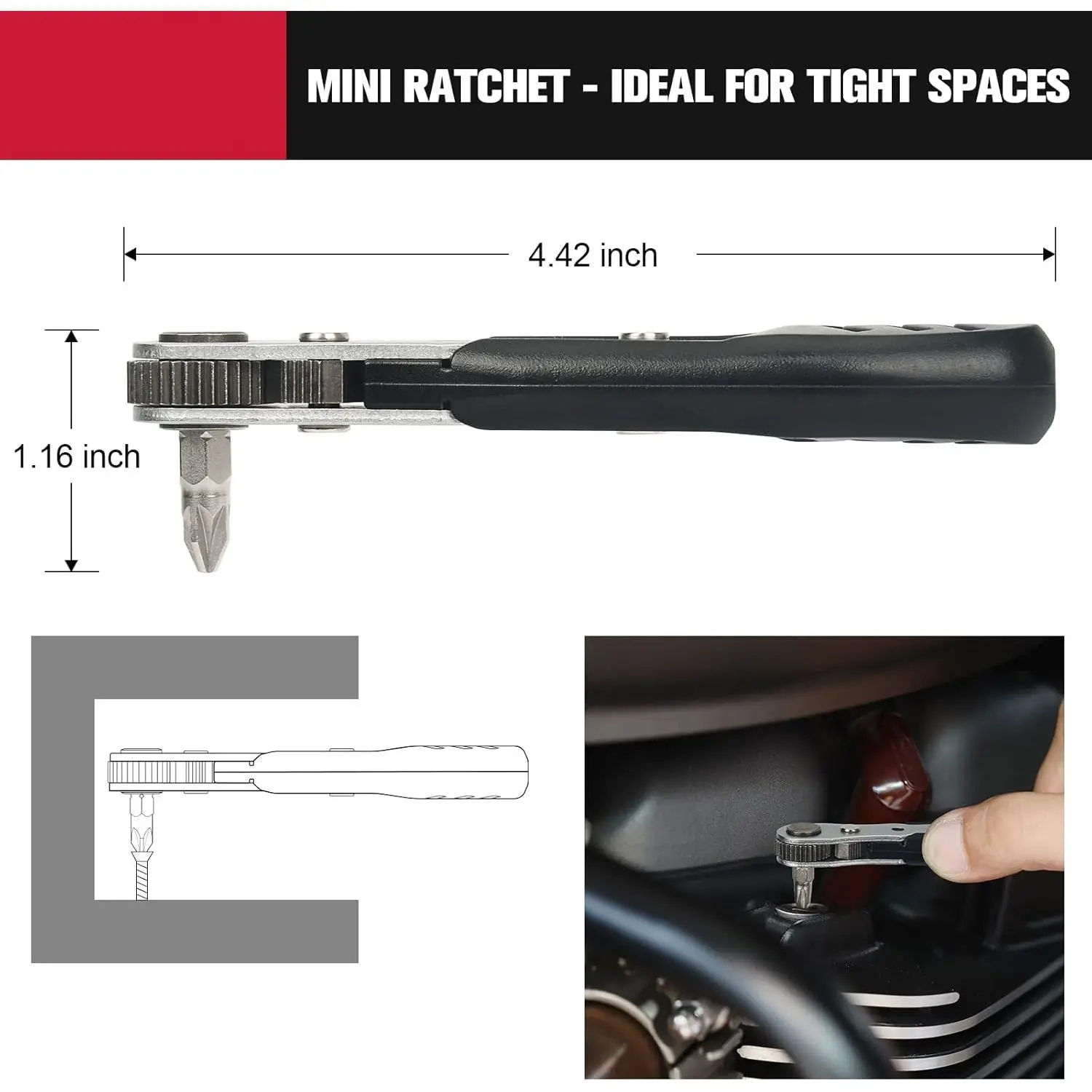 [Compact Size]The 4.25" length mini ratchet is designed with comfort and portable in mind.Only 0.47" thick making it small enough for operation in tight spots where traditional ratcheting screwdriver or stubby screwdriver might be too long to fit.ABS material handle provides comfortable and no-slip grip, carbon steel with satin chrome ensures durability and rust-resistant