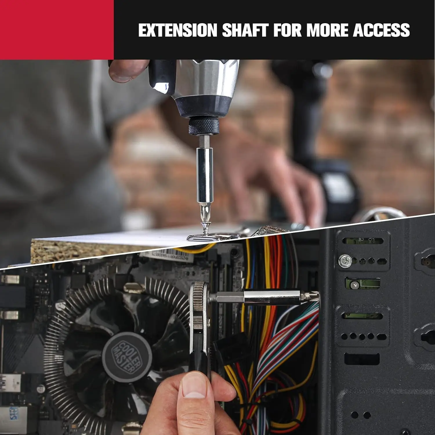 [Extensive Usage]More combinations suitable for more situations. With additional hex drive at the base of handle, this stubby ratchet could be used as a bit driver or as a stand-alone screwdriver, give you more possibility. The quick release extension bar is great for working in hard to reach areas, also ideal for power tool or impact driver.