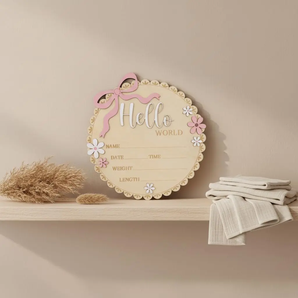 Hello World Wooden Baby Birth Announcement Sign, Pink
