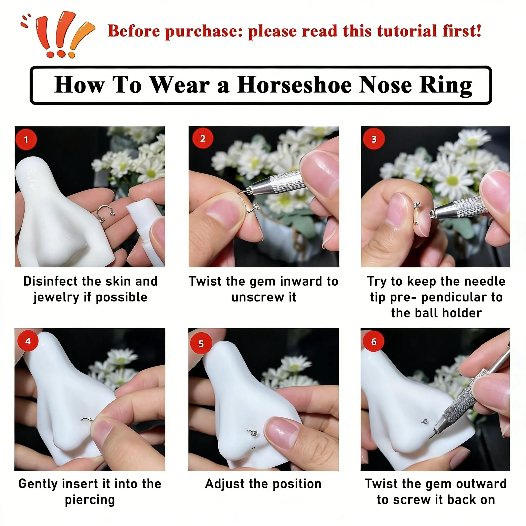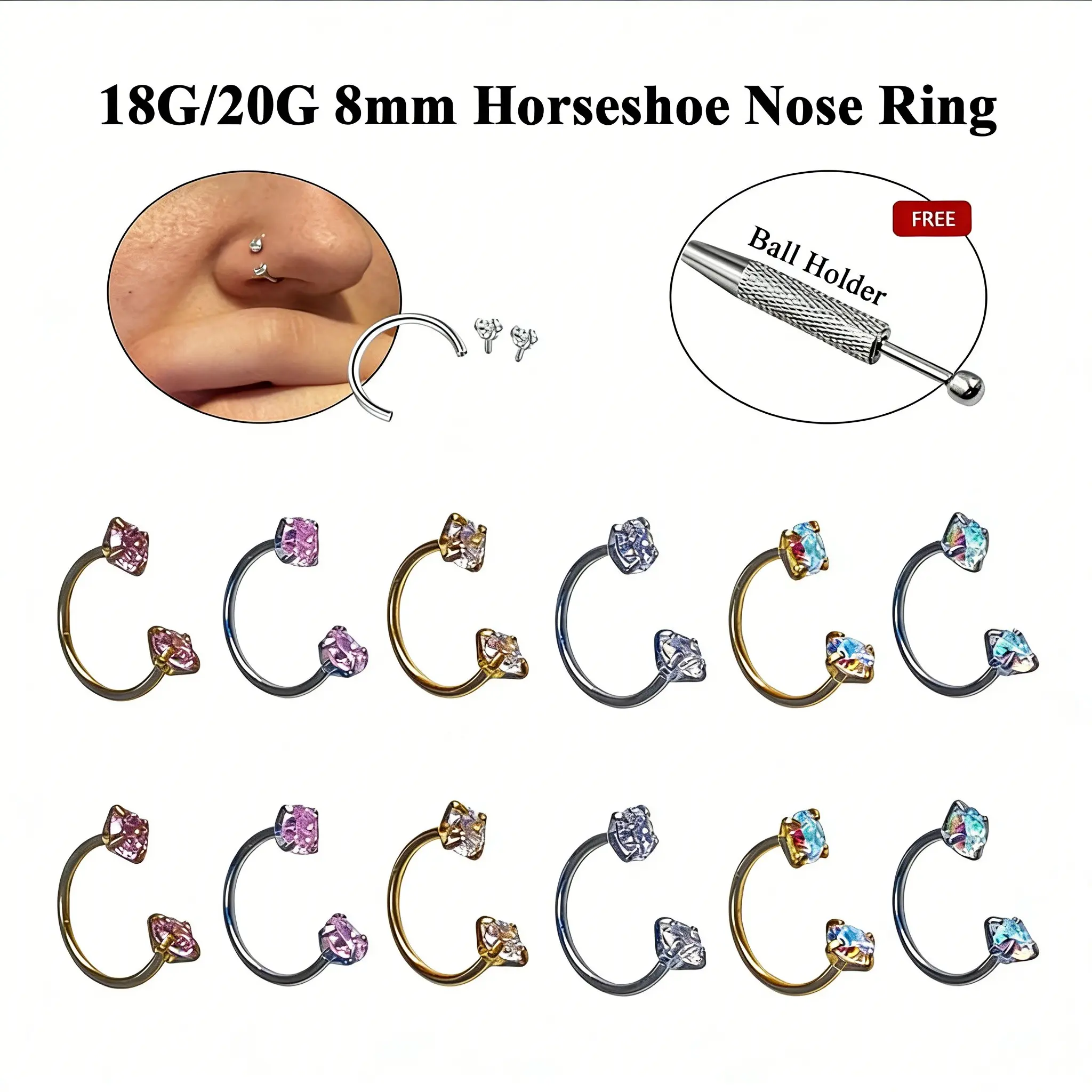 6-Piece Value Set 316L Medical Grade Titanium Nose Rings, 18g 1.0mm U-Shaped Nose Studs, Free Ball Tray and Guide Needle Included