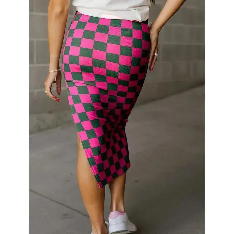 Elegant Women's Checkered Midi Skirt with Side Slit - Slimming, Casual Style in Black & White, Perfect for Fall, Machine Washable, Print, A-line, Autumn(Sheets)