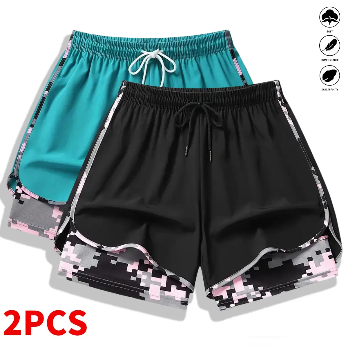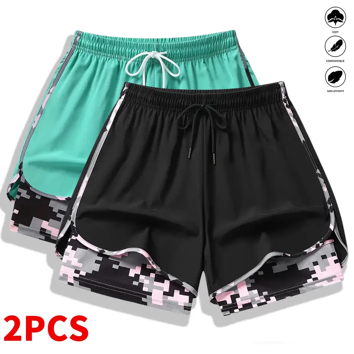 Women’s Casual Athletic Shorts, 2-pack, lined, drawstring, elastic waistband, suitable for outdoor sports, fitness, running, and casual wear, women’s shorts, athletic shorts, womenswear
