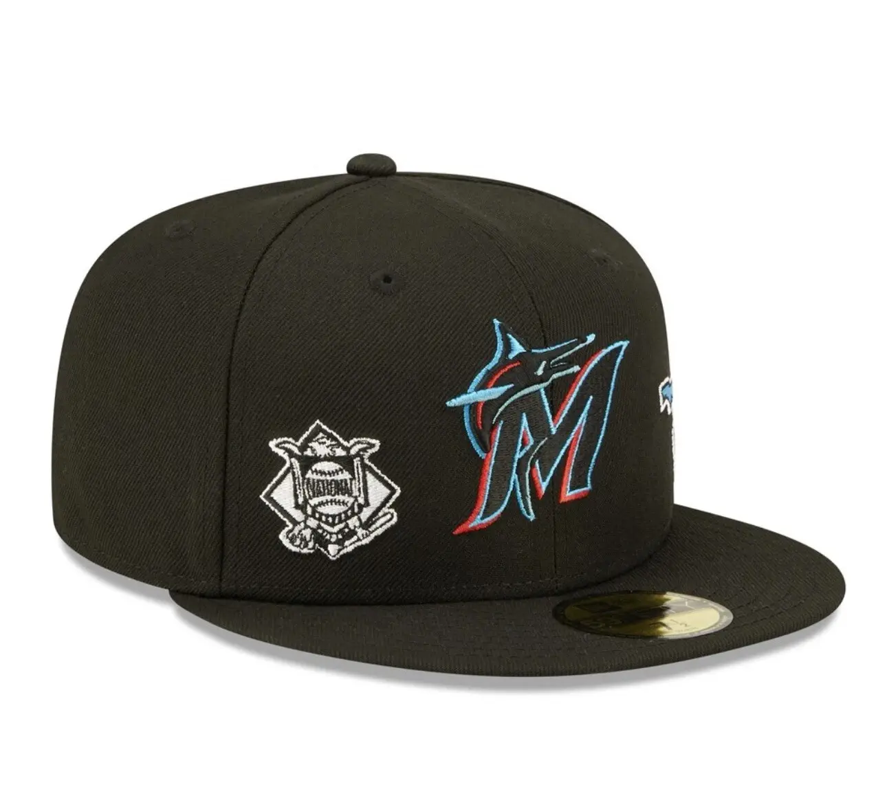 New Era 59FIFTY Miami Marlins Black Fitted Cap – Flat Brim MLB Hat with Multi-Side Embroidered Patches, Structured Crown, Premium Streetwear Baseball Cap for Men & Women