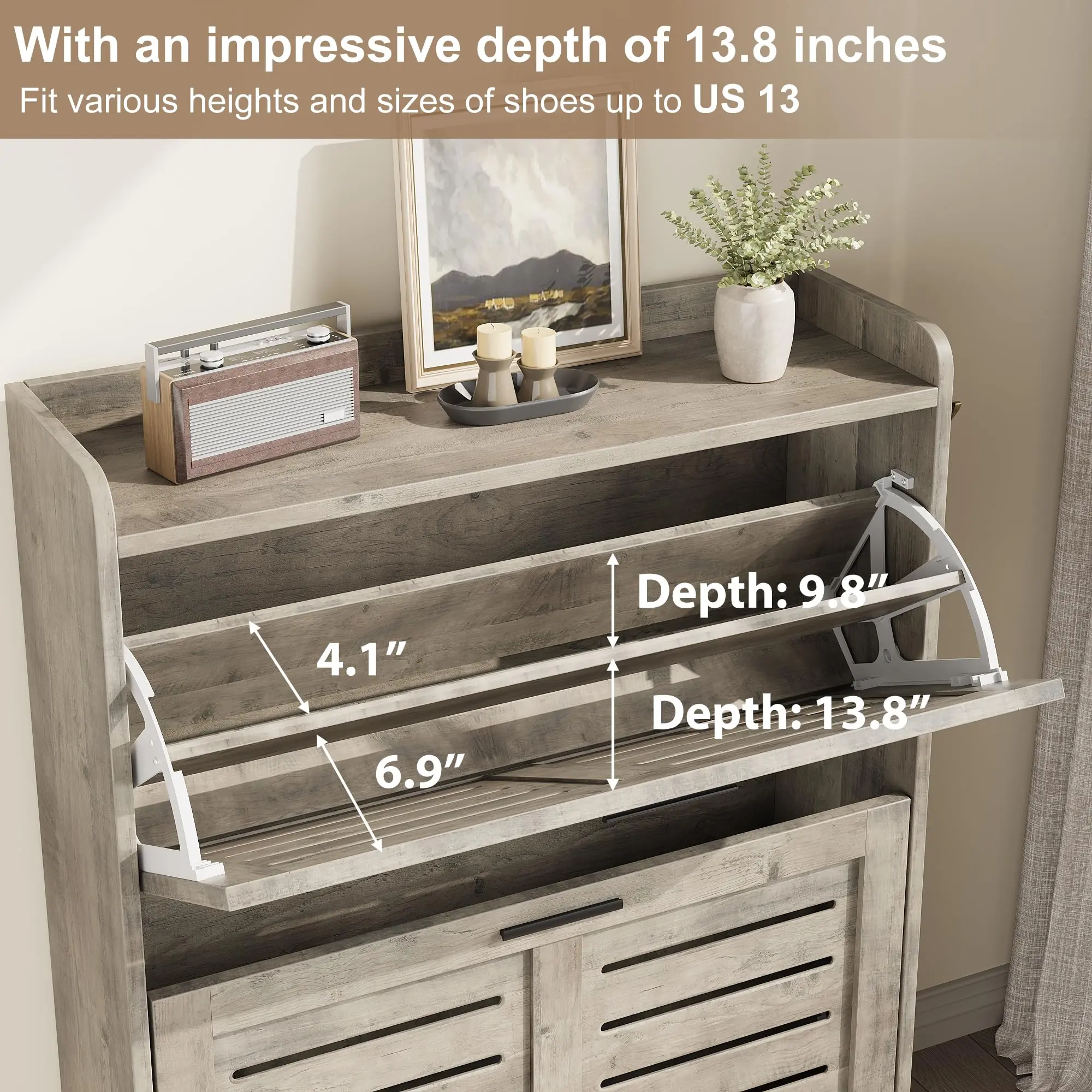 · Accommodate Every Shoe Style with Ease - This entryway shoe cabinet, with an impressive depth of 13.8 inches, caters to all your footwear needs. The adjustable and removable shelves allow you to tailor the space and can easily fit different heights and sizes of flats, mid boots, or heels, accommodating sizes up to US 13