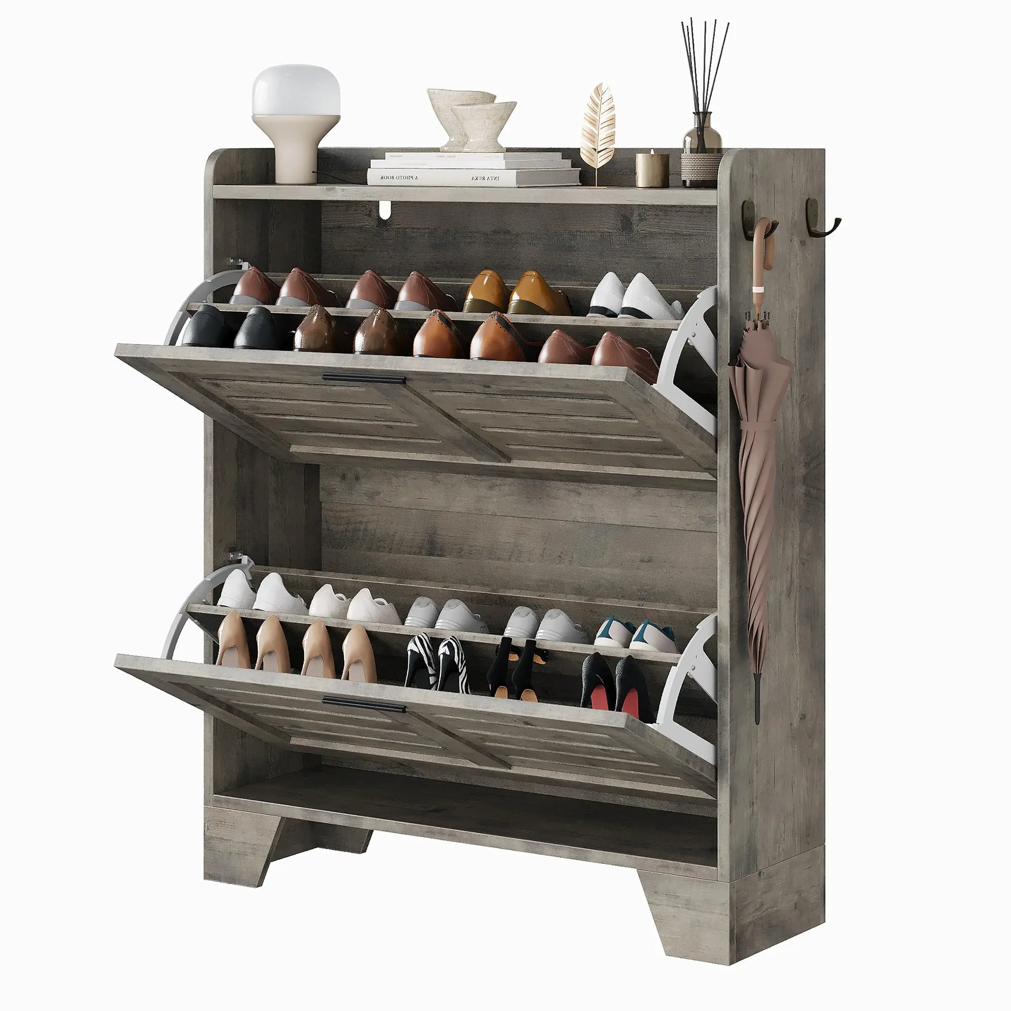 · Maximize Storage with Intelligent Design - Featuring two easy-to-open flip drawers with dual storage layers, our shoe cabinet for entryway enhances organization. The spacious top surface and two chic side hooks for keys and accessories ensure everything is within reach. Plus, the elevated base simplifies cleaning while providing a stylish solution for storing slippers