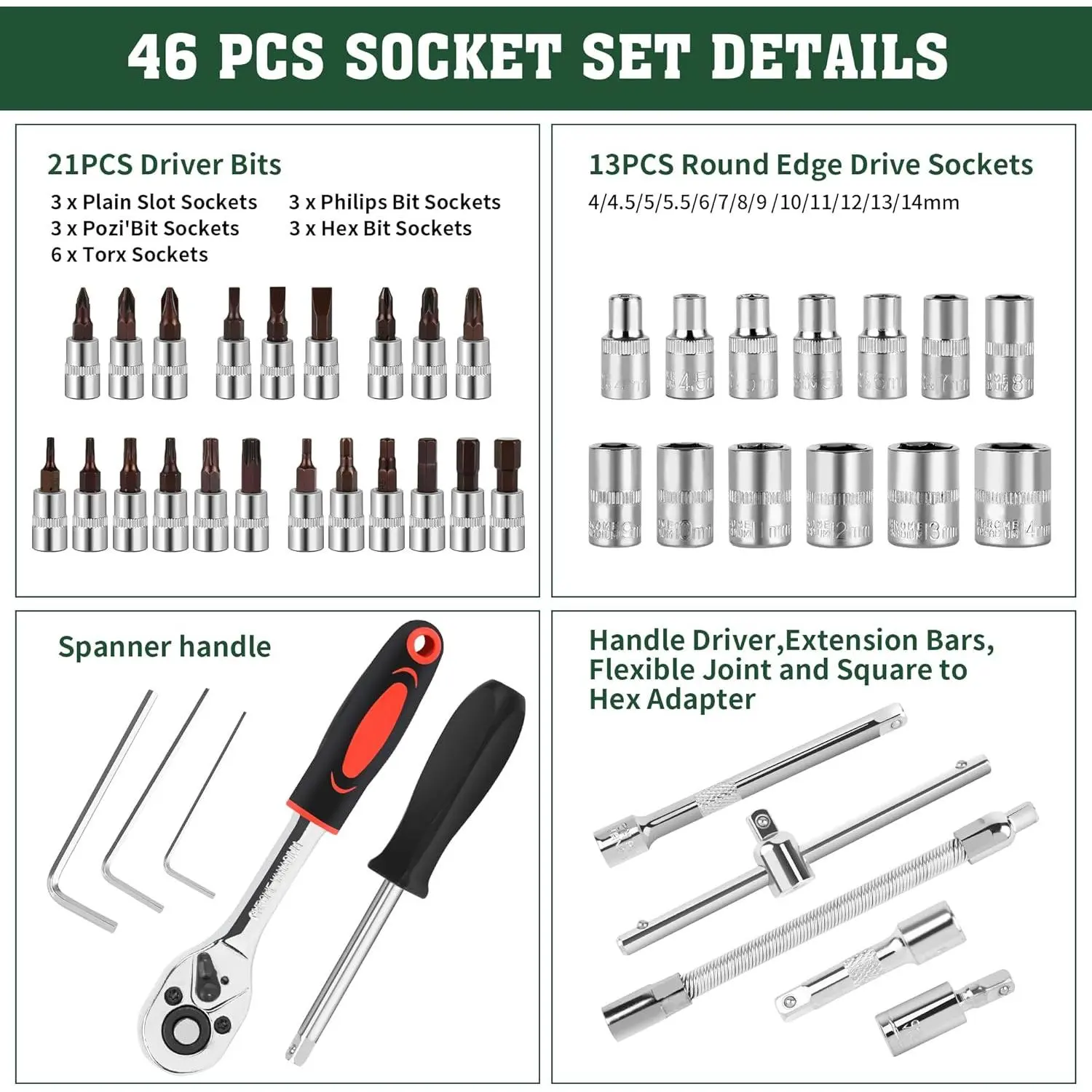 1/4 Inch Drive Socket Ratchet Wrench Set, with Reversible Ratchet, with Bit Socket Set Metric and Extension Bar for Auto Repairing and Household
