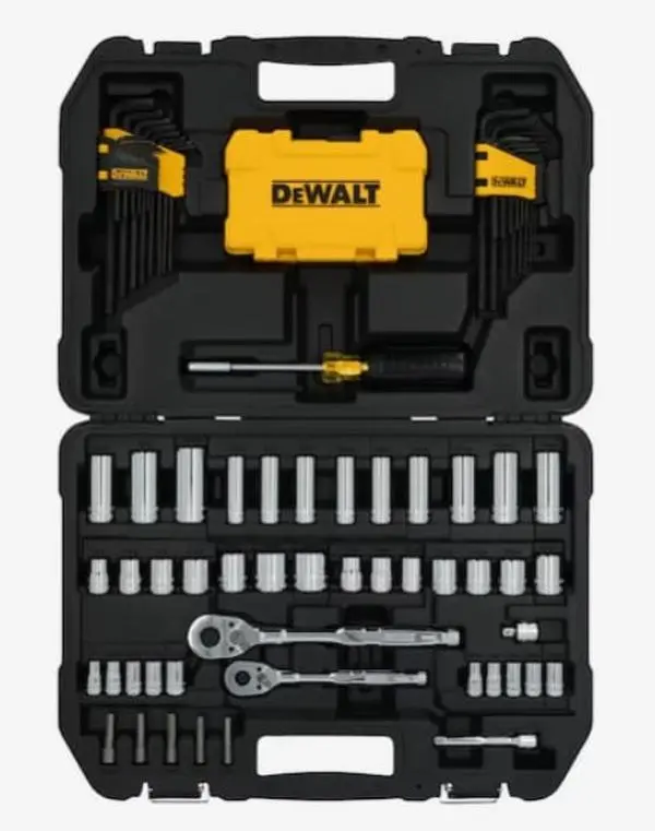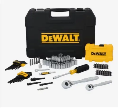 Tackle tough fastening jobs with the DEWALT TOUGHSERIES 96 pc. 1/4 in. and 3/8 in. Mechanics Tool Set. This comprehensive set includes ratchets, sockets, hex keys, nut bits, and other versatile accessories for a wide range of tasks. Featuring PowerJaw sockets for 30% more torque on rounded fasteners, 144-tooth ratchets that deliver 4X longer life and a 2.5 degree arc swing for work in tight spaces, and a full-polish chrome finish for corrosion resistance, this set is built to handle demanding projects. All tools come organized in a durable case for easy portability and storage.