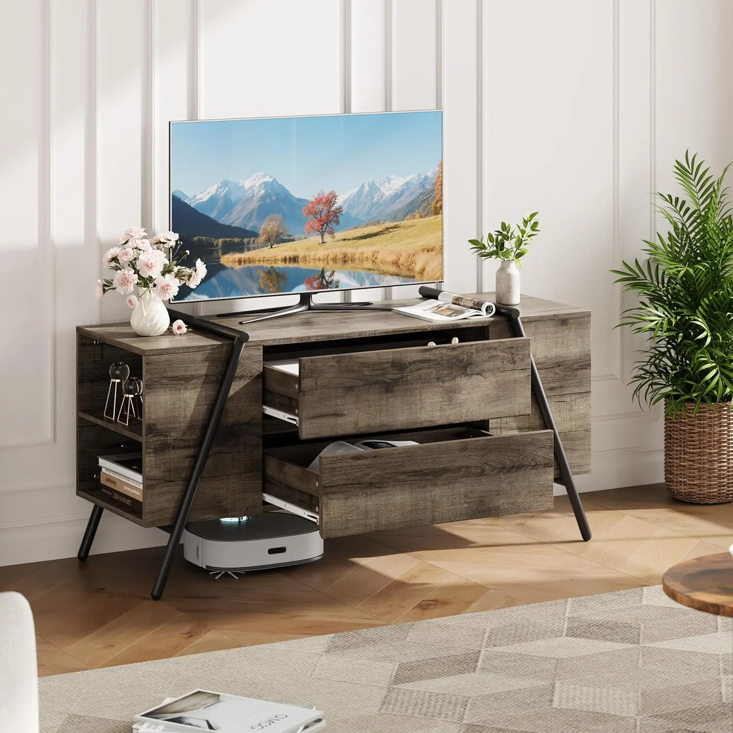 · Premium Materials & Strong Support: Crafted from premium engineered wood and supported by durable industrial U-shaped metal legs, the TV console provides reliable stability. Hidden groove pulls offer easy drawer access without interrupting the streamlined look