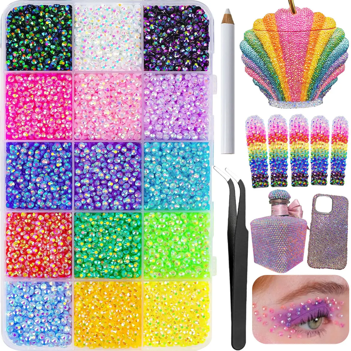 ✨ 18000Pcs 15-Color 3mm Jelly Rhinestones Kit for bedazzling. Includes 15 color-coded grids with 18,000 high-quality 3mm jelly resin rhinestones. Comes with tweezers, pickup pen, and 2 precision applicator bottles. Perfect for DIY crafts, nail art, diamond art, shoes, phone cases, and makeup decor.