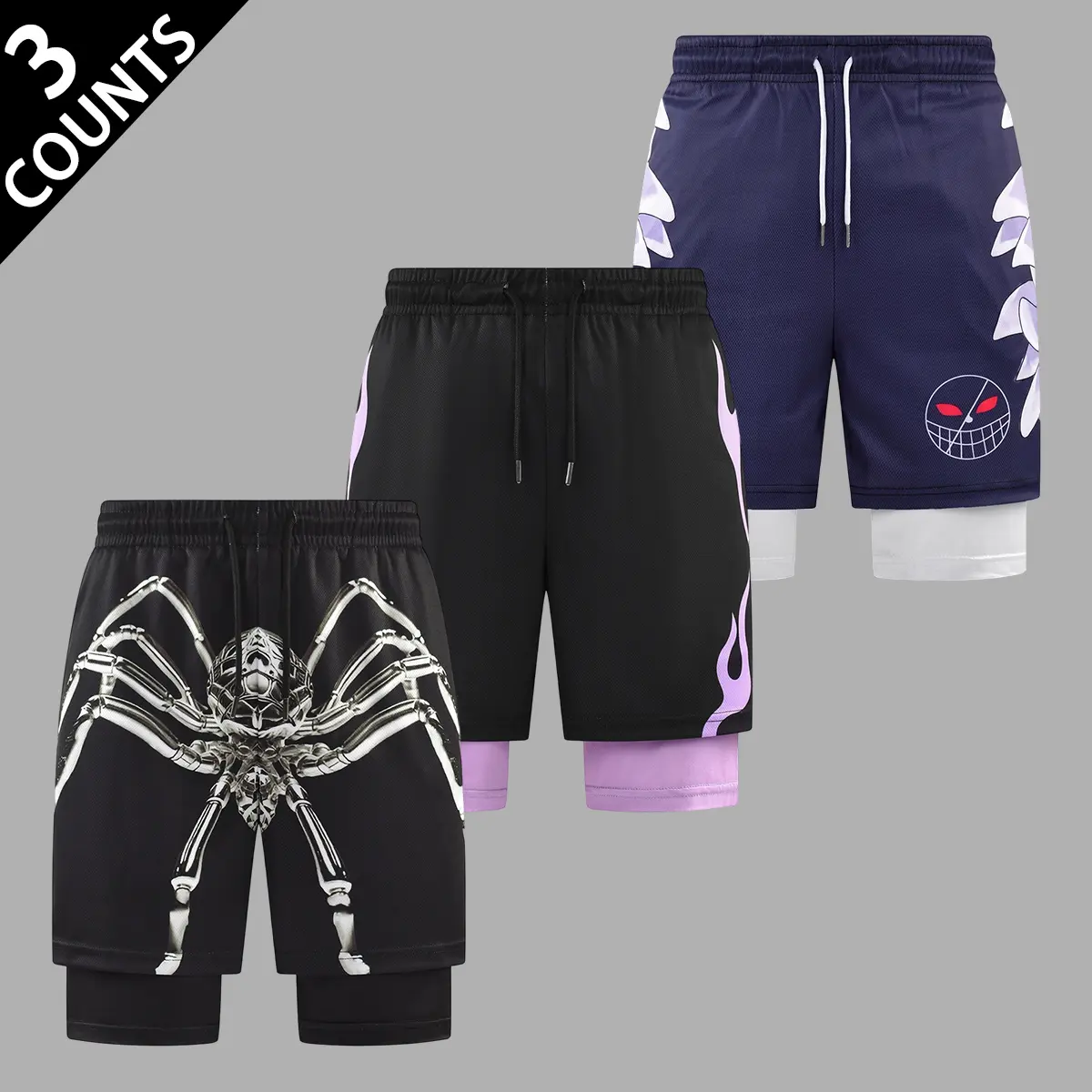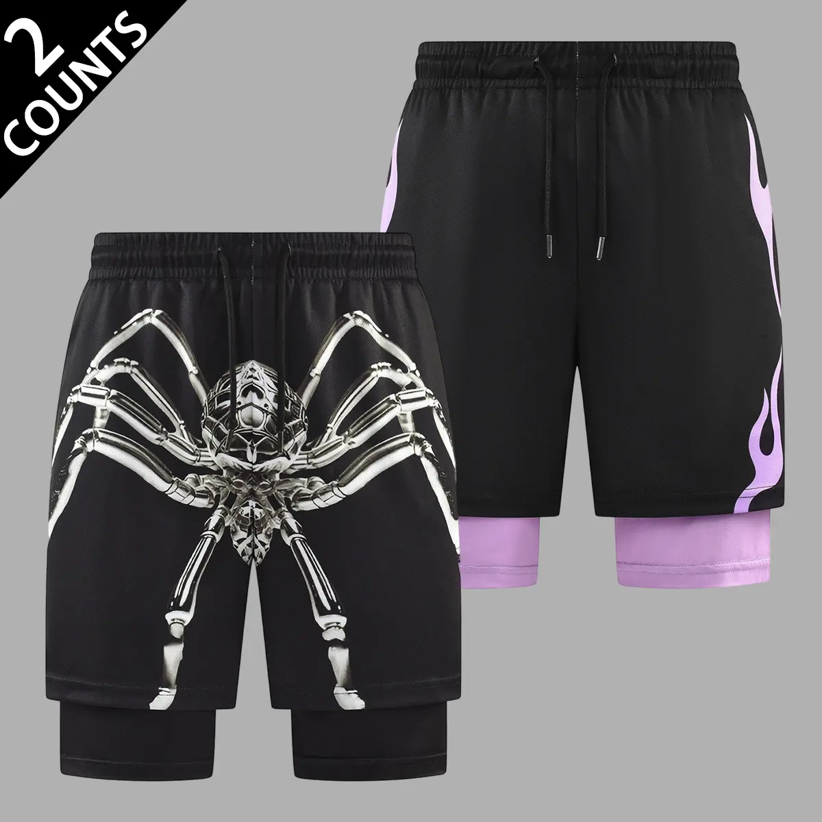 Edgy Graphic Mens Double Layered Athletic Short Gothic Spider Print Loose Fit Breathable Shorts for Daily Wear