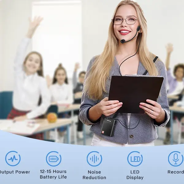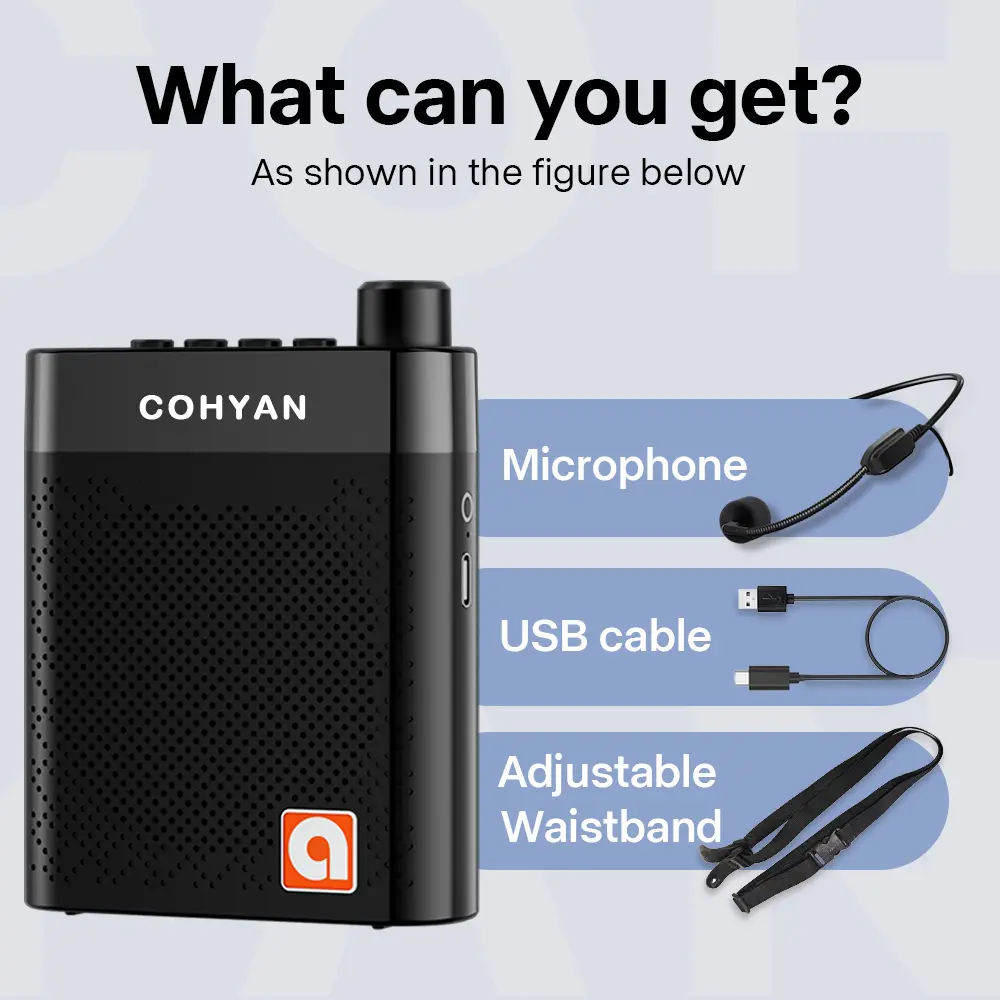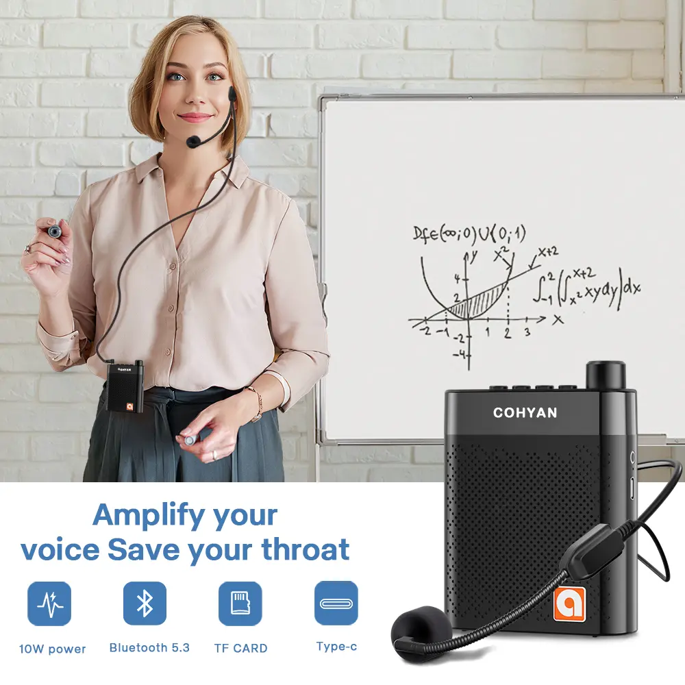 Elevate your teaching with the 【COHYAN K6】 Bluetooth Voice Amplifier. This portable wireless megaphone speaker is perfect for classrooms, training, yoga, speech, meetings, and tour guides. It features a wired headset microphone and a waistband for easy handling. Compact and noise-resistant, it ensures clear audio. Ideal for professionals needing reliable audio solutions.