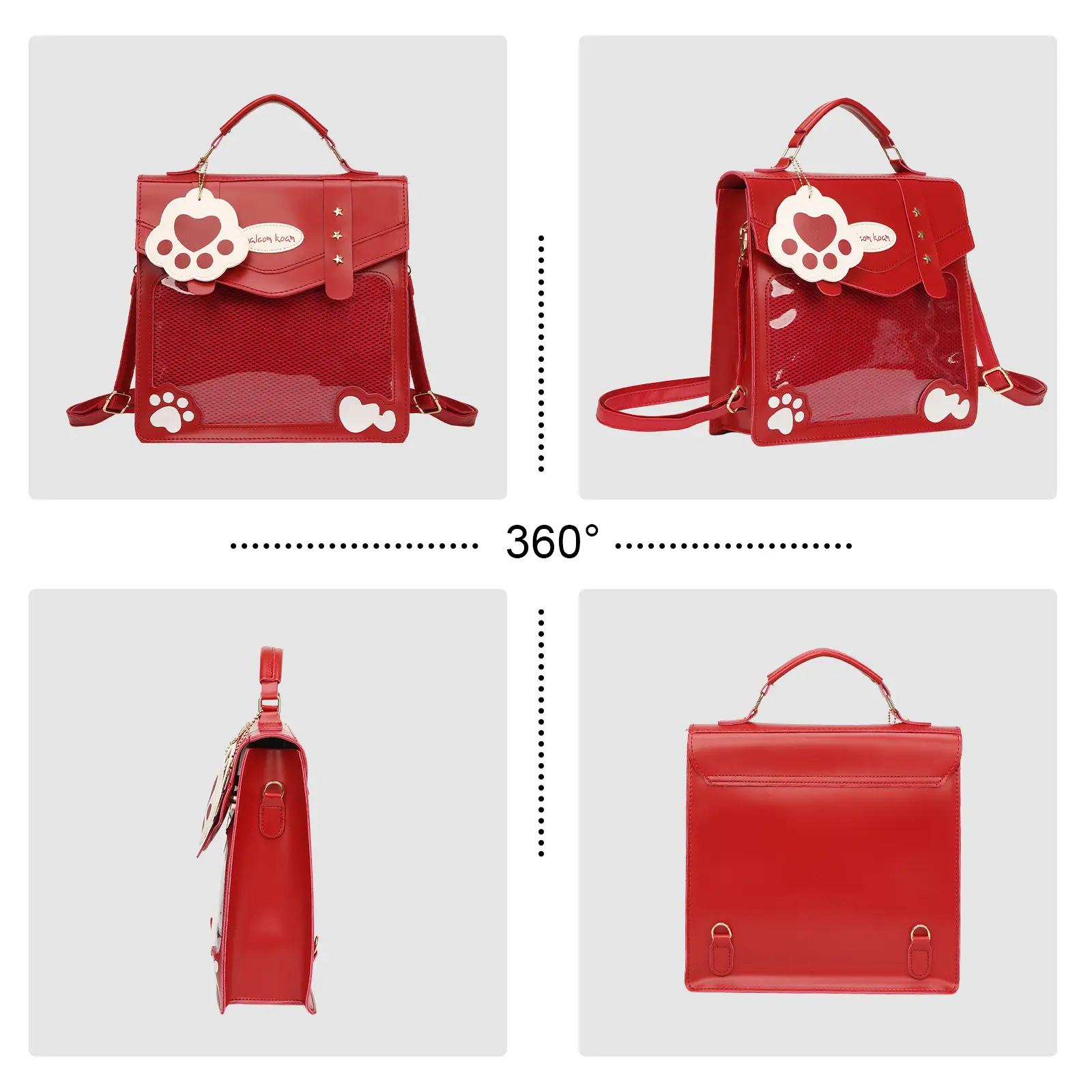 RIVERICH Kawaii Cat Paw Ita Bag - 2-Way Preppy Cambridge Style PU Leather Crossbody & Top Handle Backpack for Anime Pins, School & Daily Use | Cute Paw Charm & Star Stud Details, Adjustable Straps Stylish Multi-Way Ita Bag for Collectors