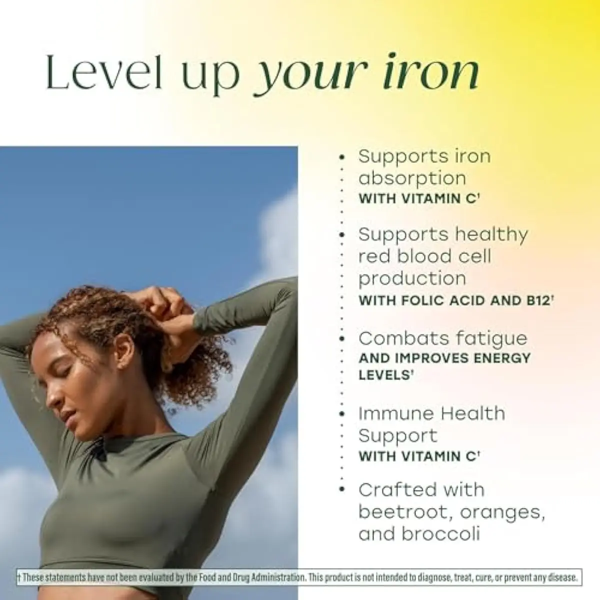 SUPPORTS RED BLOOD CELL PRODUCTION: These iron supplements for women include folic acid and B12 which help maintain red blood cell production and delivers a gentle and effective 26 mg of iron per serving to combat fatigue and improve energy levels+