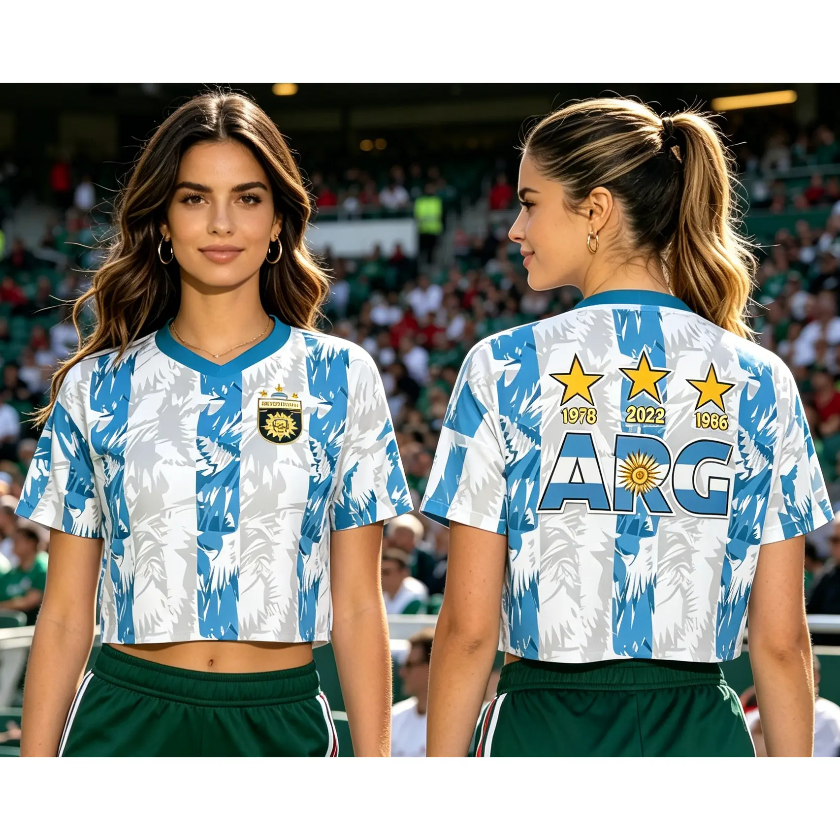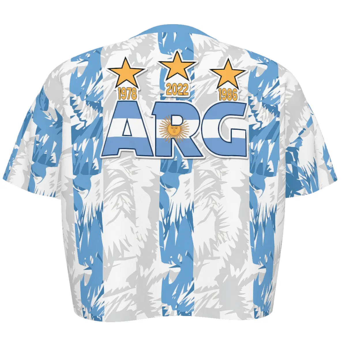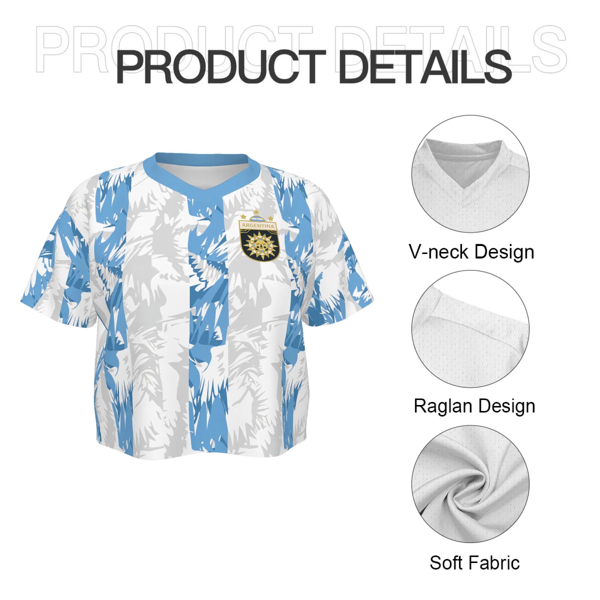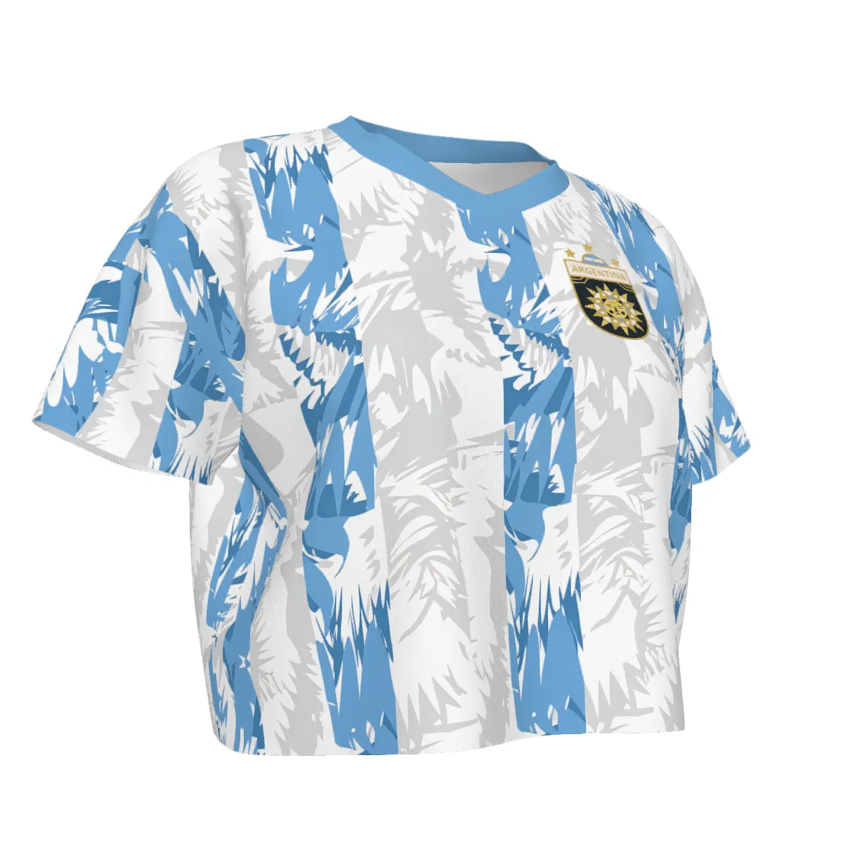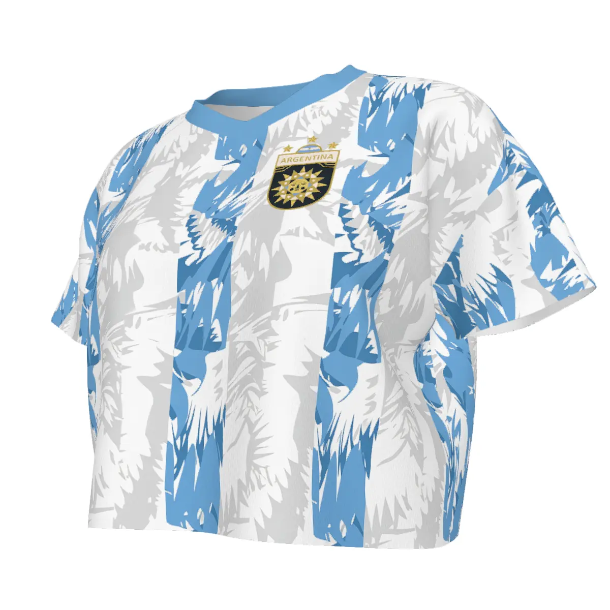 Women's Argentina crop top soccer jersey.Iconicblue & white stripes, Y2K retro jersey style. Light, breathable fabric. Cropped fit, V-neck. Perfect for Argentina fans & streetwear.