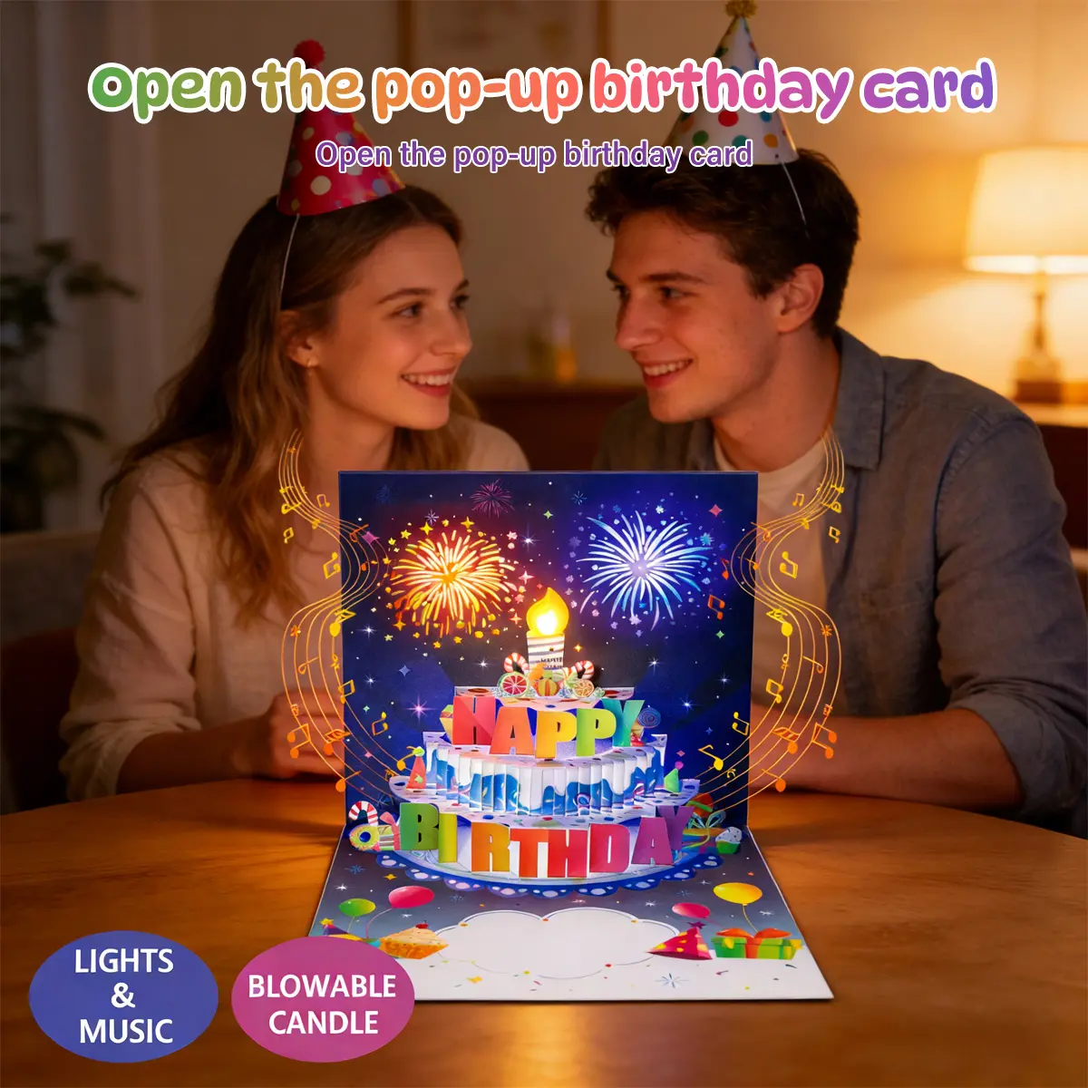 Blowable Firework Birthday Cards 3D Pop Up , Musical LED Lights Birthday Cards with Birthday Cake, Greeting Cards, Birthday Gifts for Mom Women Men Kids Child Dad Father Wife