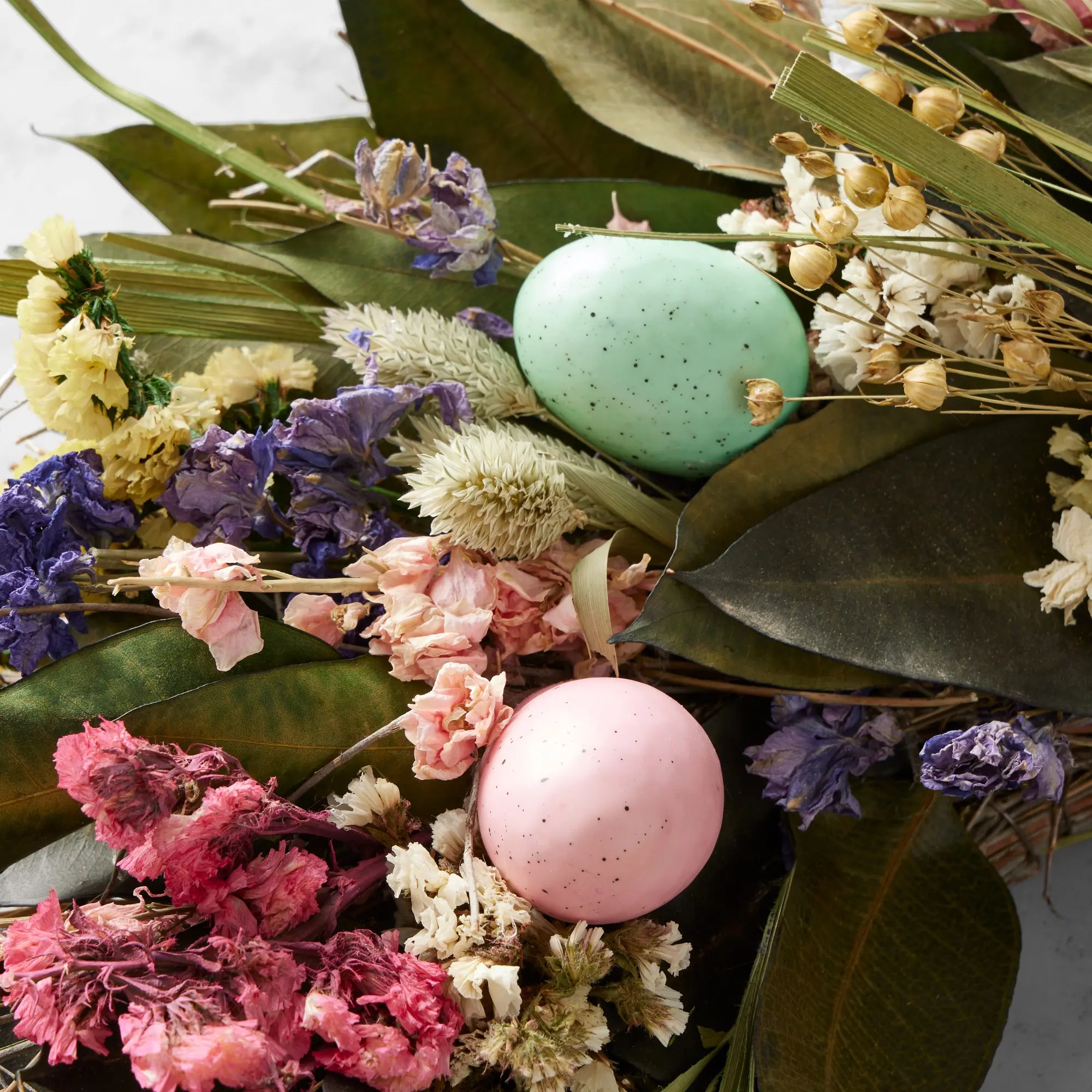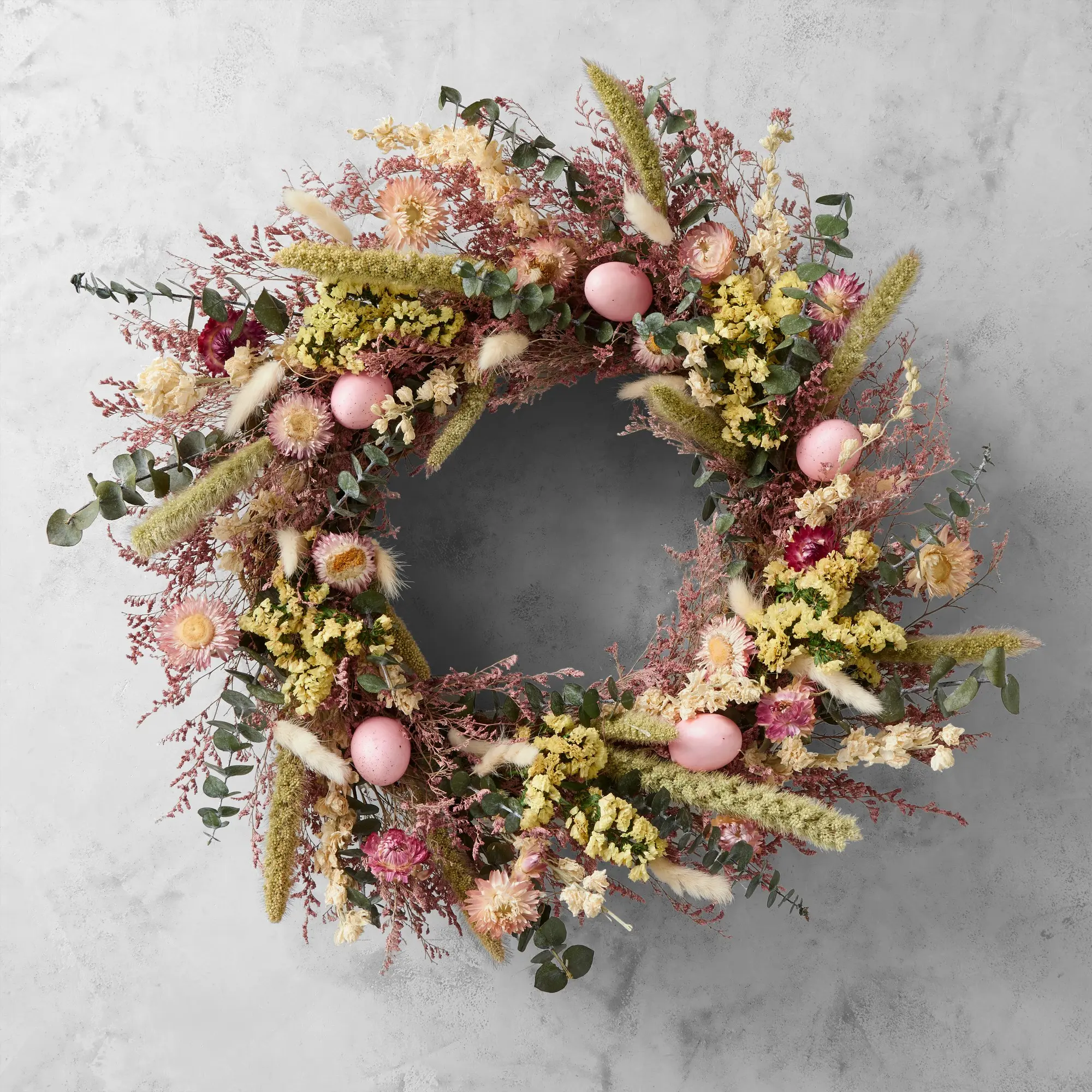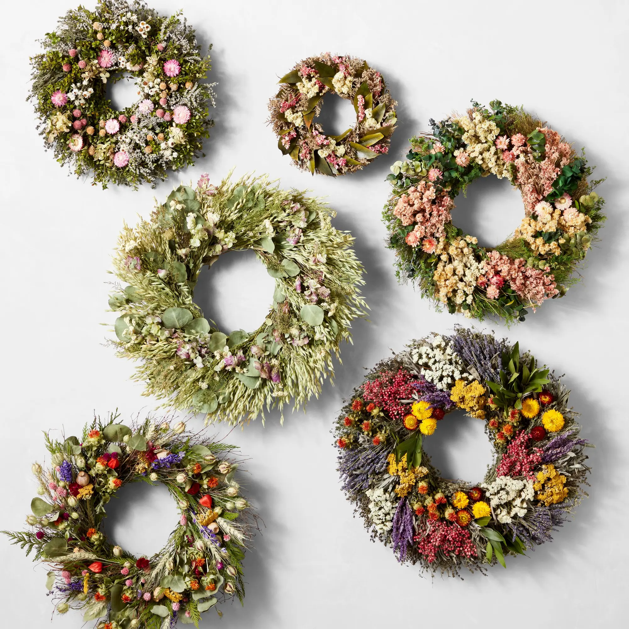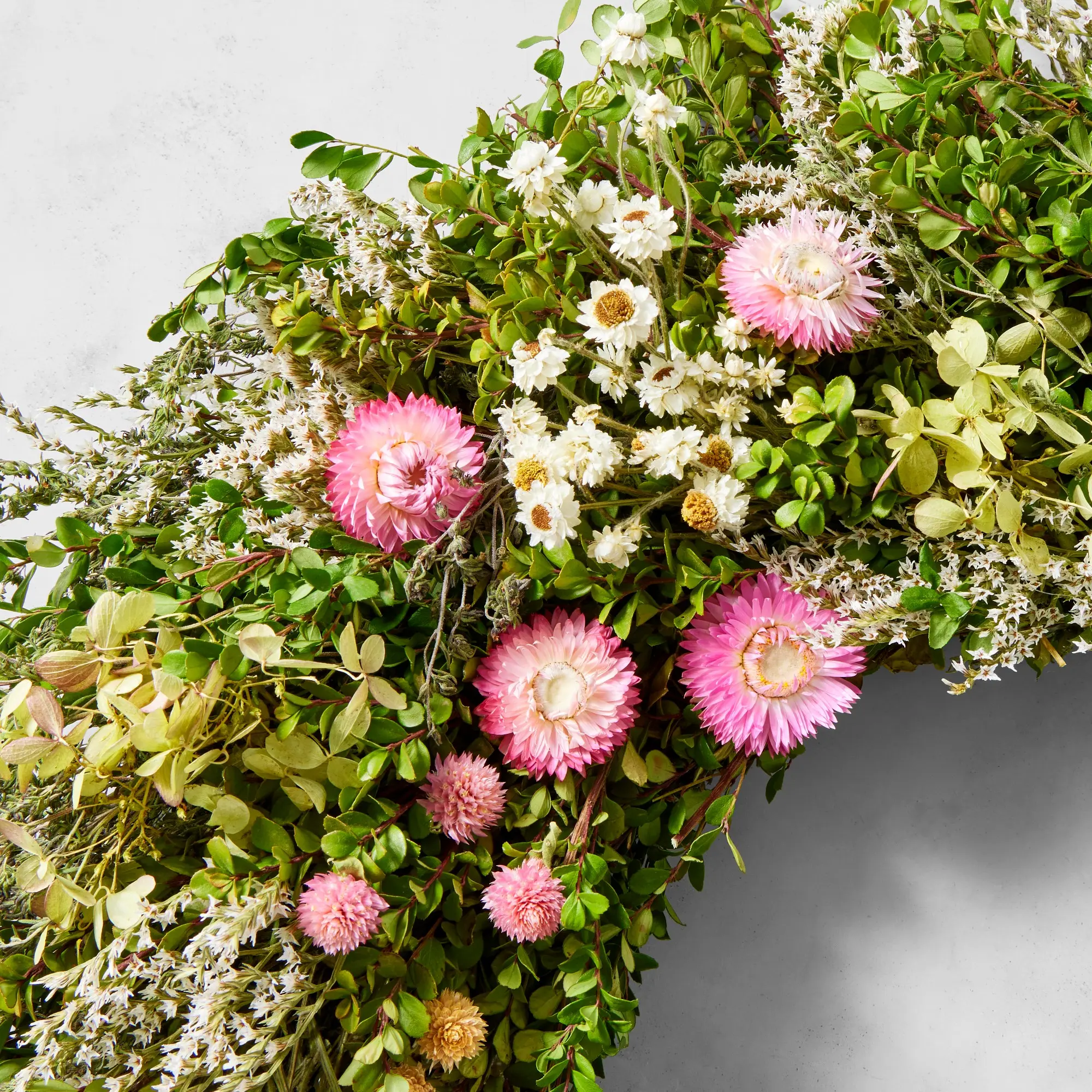 Like a crown for a May Day celebration, this beautiful wreath has all the exuberance of spring. Inspired by our Famille Rose dinnerware collection, which features a bountiful floral design, this wreath is made by a family-owned business in California using fresh and preserved plants grown on their farm. Evergreen boxwood and savory provide a bed of greenery that's accentuated with the pastel hues of ammobium, amaranth, strawflower, statice and hydrangea.