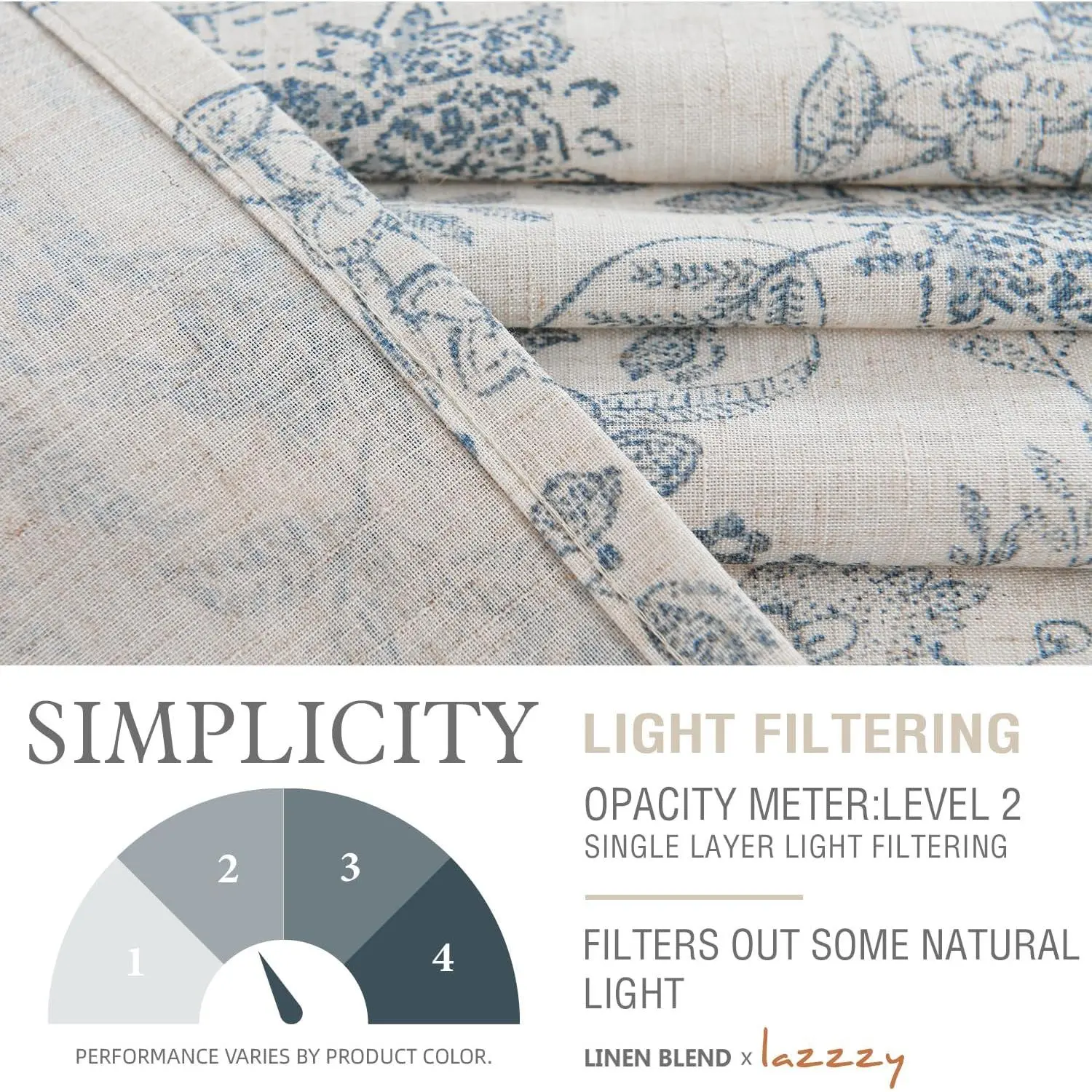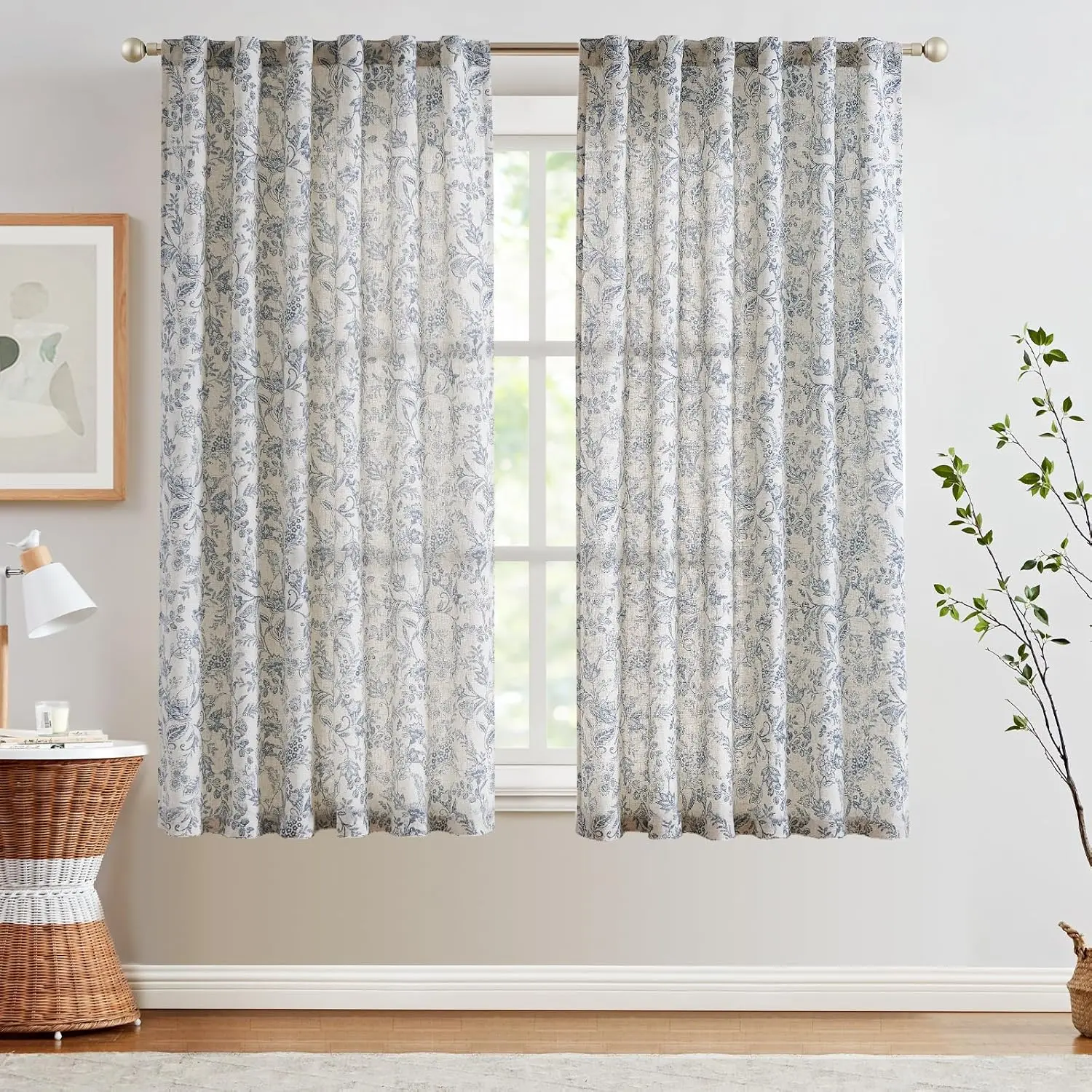 Ready Made: Package includes 2 linen curtain panels, each measuring 50"W & 63"L (100"W for pair).The linen curtains are crafted from open weave linen blend fabric and primitively natural effect make the curtain panels more drapery and aesthetic.Vintage Design: The linen blend floral print curtains add soft dimensions to windows for a space that feels rustic yet complete. Understated hues give an updated sensibility to this elaborate botanical print design. Its graphic pattern in subtle tones lends the appearance of a secluded forest.Light Filtering: Beautifully frames your windows with a soft and hazy vision.Filter out harsh sunlight and let the breeze flow through your windows.Appears a light, airy and privacy look for living room, bedroom, dining room, kitchen, bathroom, laundry room, french door or sliding door.Back Tab Style: Our linen textured curtains feature 2 inch pole pocket head to coordinate with most window curtain rods, easy to hang and maintain. Each linen curtains offers 2 hanging options to meet your needs: rod pocket or back tab, and also work with rings or clips (not included).Easy Care: Our linen blend curtains sets are durable due to the fine material and good workmanship. Machine wash in cold water in gentle circle and tumble dry in low setting. Do not bleach. Creases from packing and shipping can be pressed by ironing or steaming.