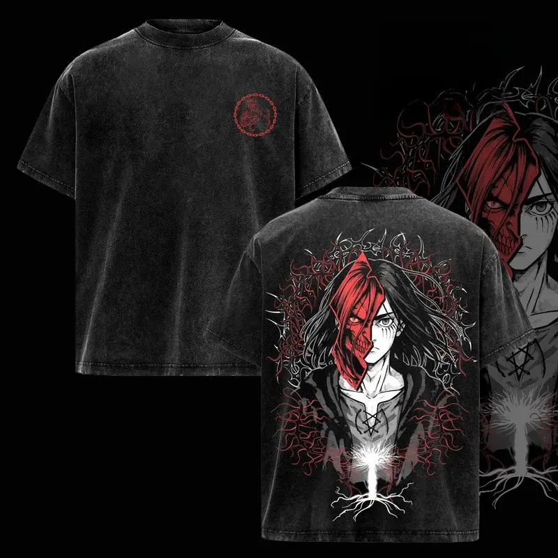 Eren Yeager "The End" Attack on Titan Graphic Tee – Final Season Oversized Acid-Washed Anime Shirt, Cotton Streetwear Unisex Top, Trendy Menswear for Casual, Party, Convention, and Anime Fans