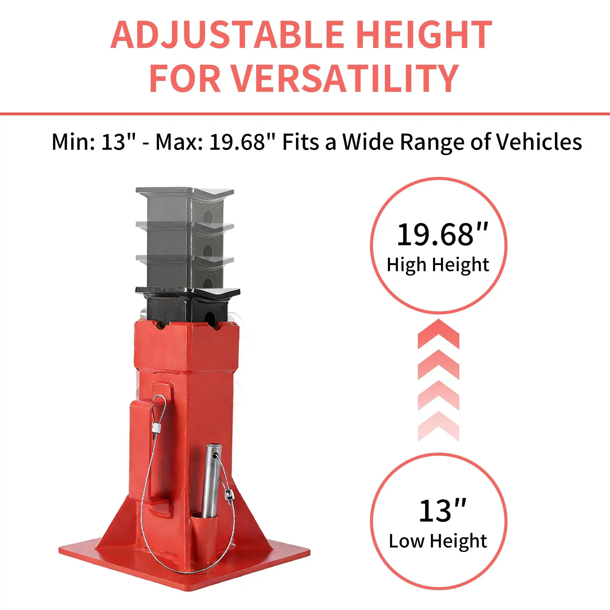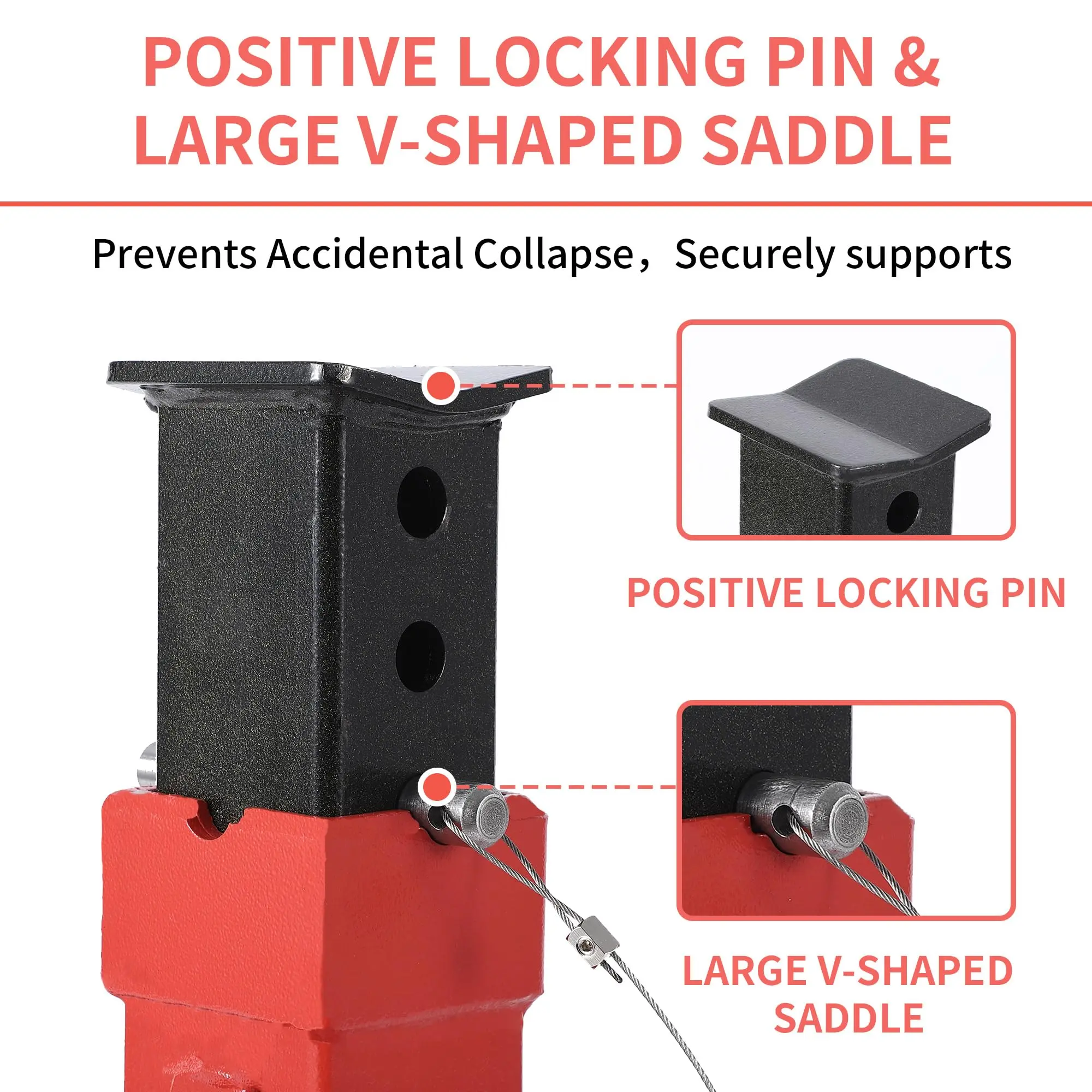 ·Adjustable Height: Effortlessly adjust the height range—12 Ton: 11 to 18 inches, 22 Ton: 13 to 19.6 inches—using the quick-release locking pin system for secure and customized support during maintenance or repairs.