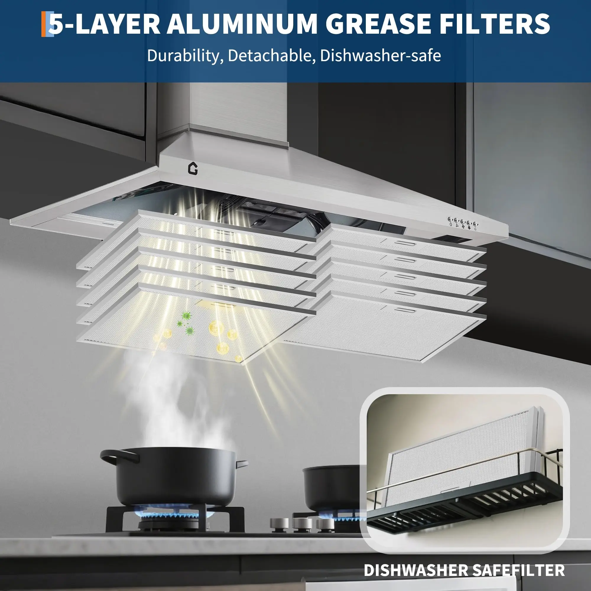 ·Heavy-Duty Baffle Filters: Featuring reusable aluminum baffle filters, this 30 inch range hood offers superior grease trapping and optimal airflow control. These professional-grade filters are dishwasher-safe and easy to remove, ensuring your kitchen exhaust hood remains efficient and simple to maintain