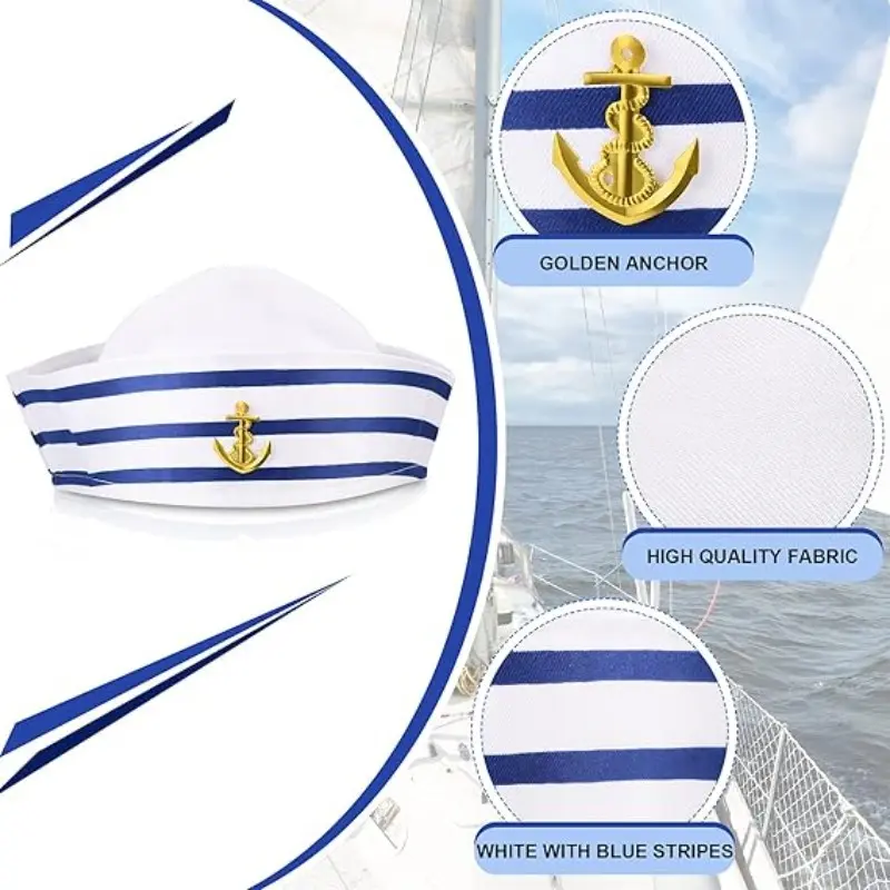 Blue Striped Sailor Hat with Gold Anchor, Nautical Theme Headwear, Adjustable Ocean Hat for Parties and Role Play, Classic Navy Style